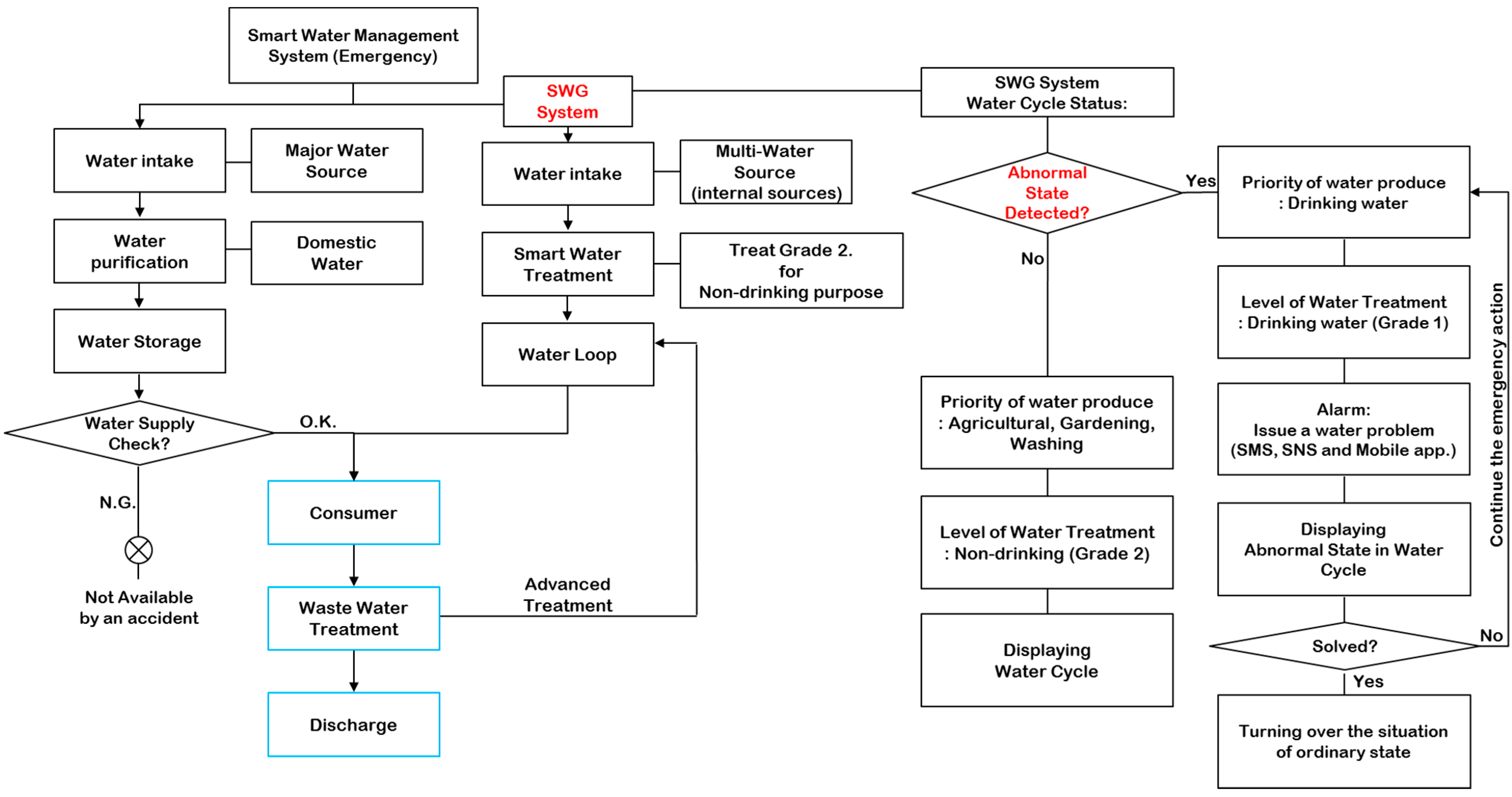However, if the value of WB in Equation (1) is less than zero by cutting off water supply because of accident or drought, it is an emergency state and it is necessary to secure water to further supply it to customers. The system shows the emergency warning message at the place in distress and the general procedure should be changed for the emergency water management mode illustrated in the Figure 8 with abnormal state detection. As the concept described above shows, the drinking water can be supplied through the water storage reservoir and the alternative water resource can only supply non-drinking purpose domestic water unless the water treatment facility to produce drinking water is prepared. The smart water treatment plant is simply producing non-drinking purpose water through minimized water treatment procedures. The system tries to send messages to the consumers to inform them about the non-drinking purpose water supply.
