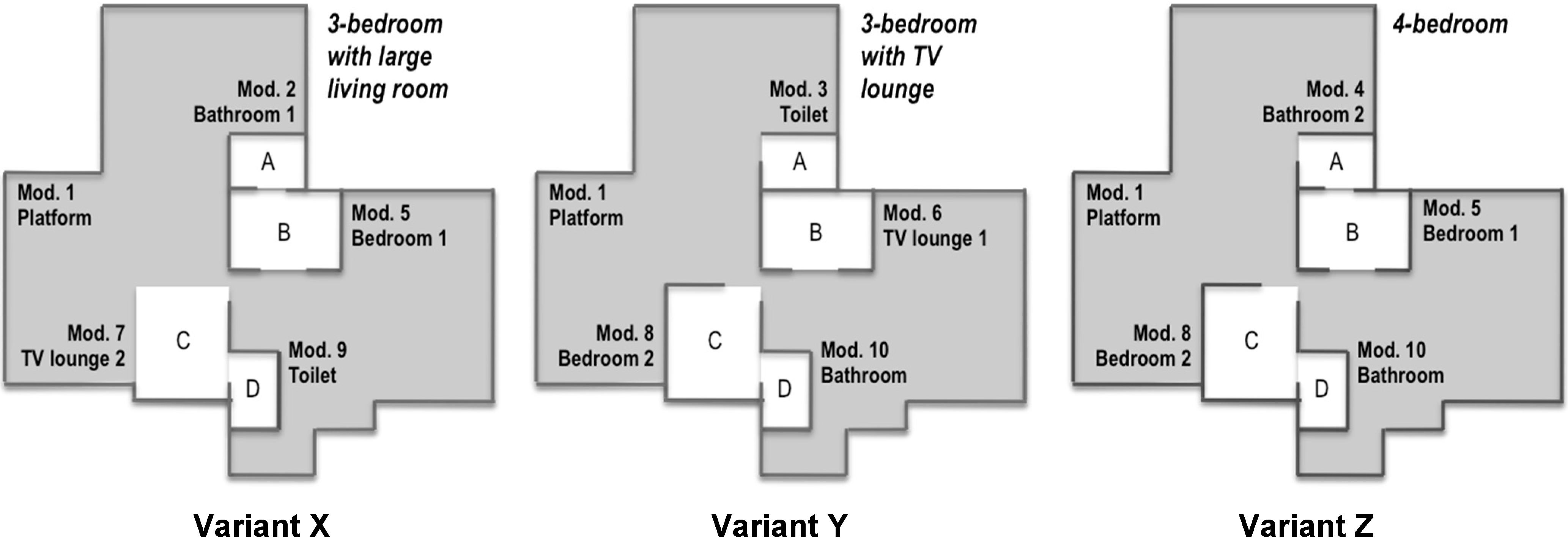 By contrast, the choice of floor plan is at a high hierarchical level in the product architecture design as the function (layout) is provided by several components. Product variants are created by altering the primary functions of some spatial voids (and the solid mass associated to it) while keeping the rest of the apartment unchanged. In Project J, there are three product variants: 3-bedroom apartment with large living room (product variant X), 3-bedroom apartment with TV lounge (product variant Y), and 4-bedroom apartment (product variant Z). They are provided by changing the primary functions of four rooms (A, B, C, and D)—see Table 4 and Figure 2.