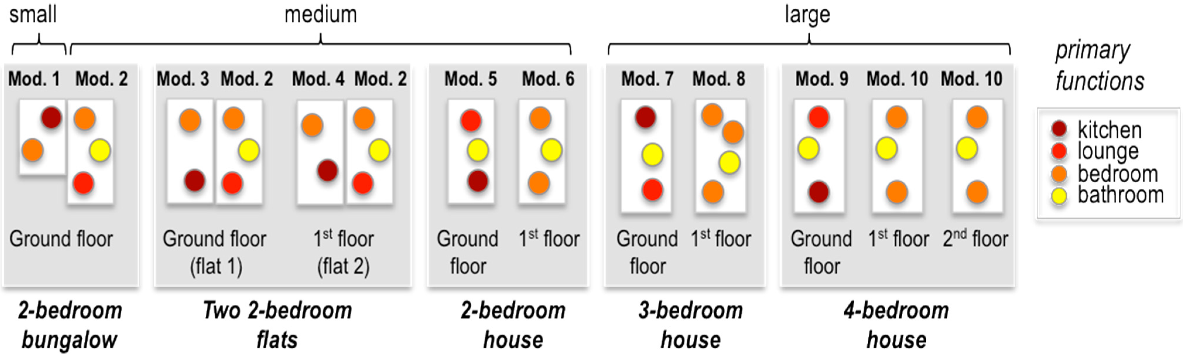 Both components and spatial product architecture perspectives were considered in each case study. The components perspective is not novel, as it is described in most product modularity studies in manufacturing. This perspective has been previously adopted also in house-building design. For example, the product architecture described by Hofman et al. [4] adopts a component perspective since it involves three module types (columns, exterior walls, and floors) that fulfil secondary functions, and which are mixed and matched to created different building types. Conversely, the spatial perspective has not been widely investigated in house-building. In that perspective, each module involves a wide assortment of interconnected components. Consider for instance the different components needed (e.g., floor, ceiling, walls, fixtures, finishing) to create a module that supports the primary functions associated with a bedroom (e.g., to read, to sleep, to watch TV). In a spatial perspective, modules should involve sizeable portions of the product, resulting in fewer modules and interfaces. These fewer modules and interfaces are beneficial from a production viewpoint, due to the reduction in the number of modules that need to be produced. However, devising a modular architecture defined by a one-to-one allocation scheme and decoupled interfaces can be challenging, because each spatial void requires several components.