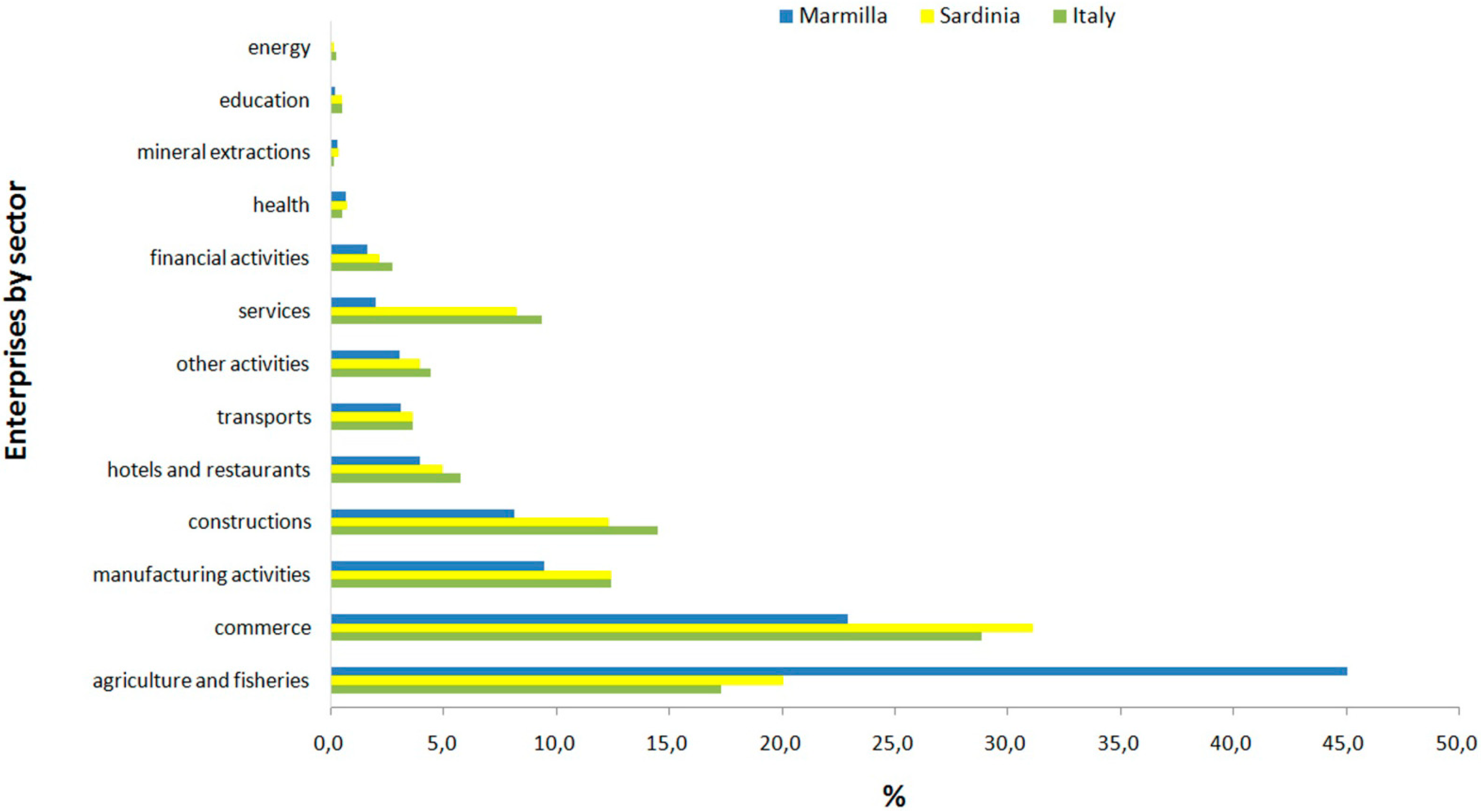 Sardinia was chosen for this study for several reasons. First, this island’s rural tourism processes have never before been considered as offering an alternative, more consolidated development model relative to the seaside model. Rural tourism has always been regarded as secondary to seaside tourism. The development of a rural development model, however, could facilitate the attenuation of Sardinia’s imbalances by countering the seasonal ebbs and flows characteristic of seaside tourism. Secondly, Sardinia ranks eleventh in the total number of Italian farms by region, and represents the median number of farms (Table 3). For these reasons, Sardinia is considered to be representative of the rural Italian reality. This case study of the natural region of Marmilla in Sardinia also addresses questions associated with integrating the cultural, natural, and rural heritage. Even though the Marmilla region has this significant potential, a strategic process for tourism planning has not yet been created. In this paper, based on the following concepts: tourism, rurality, and cultural heritage, the author defines the conditions needed to initiate a process of reflection that could lead to defining a strategic tourism planning process.