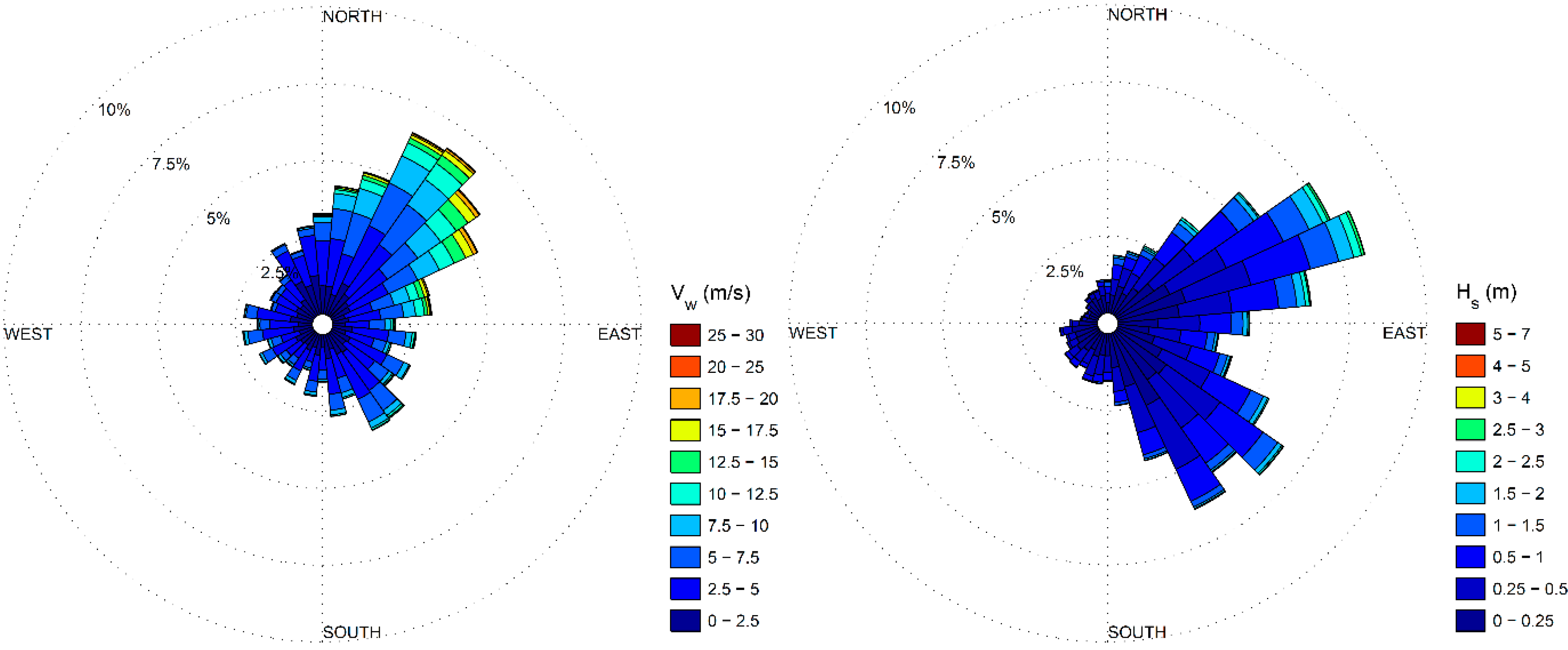 The mean annual wind and wave regimes are represented in Figure 2 by means of the frequency/direction/intensity diagram (i.e., rose diagram). Both mean wind velocities, Vw, and significant wave heights, Hs, clearly show two main directions from the North East (Bora, between 0°N and 85°N) and from the South East (Scirocco, between 105°N and 175°N), being the Bora direction dominant both in intensity and frequency.