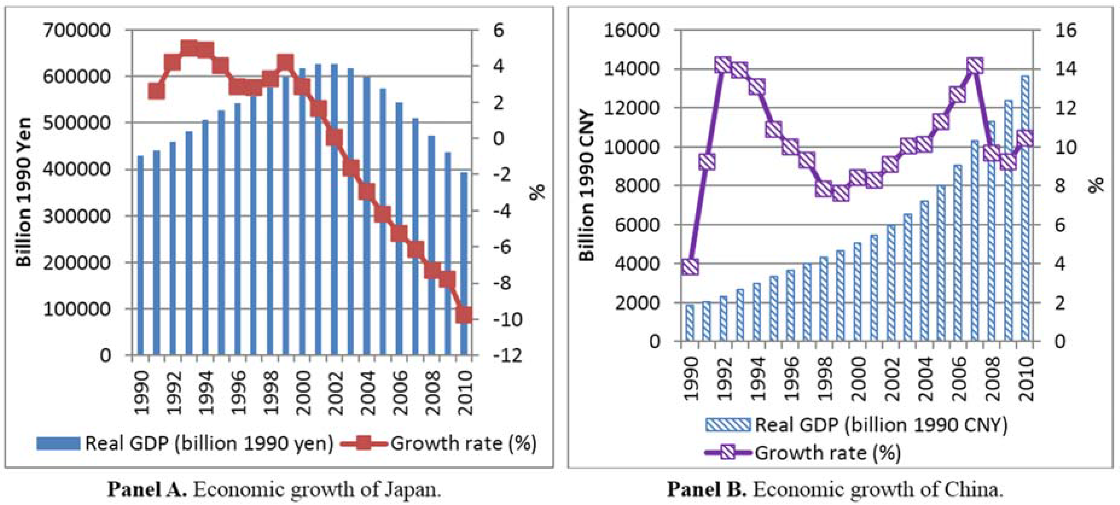 Real GDP of Japan showed an inverted-U shape, which increased from 429,860.4 billion yen in 1990 to 626,761.8 billion yen in 2001 and then dropped to 393,387.2 billion yen in 2010 (at constant prices in 1990). The average annual growth rate of the real GDP of Japan was −0.3% (Figure 1. Panel A). Economic growth of China showed an increasing trend due to the promotion of urbanization and industrialization, which increased from 1866.8 billion CNY in 1990 to 13,643.5 billion CNY in 2010 (at constant prices in 1990). The average annual growth rate of GDP in China was 10.1% (Figure 1. Panel B).
