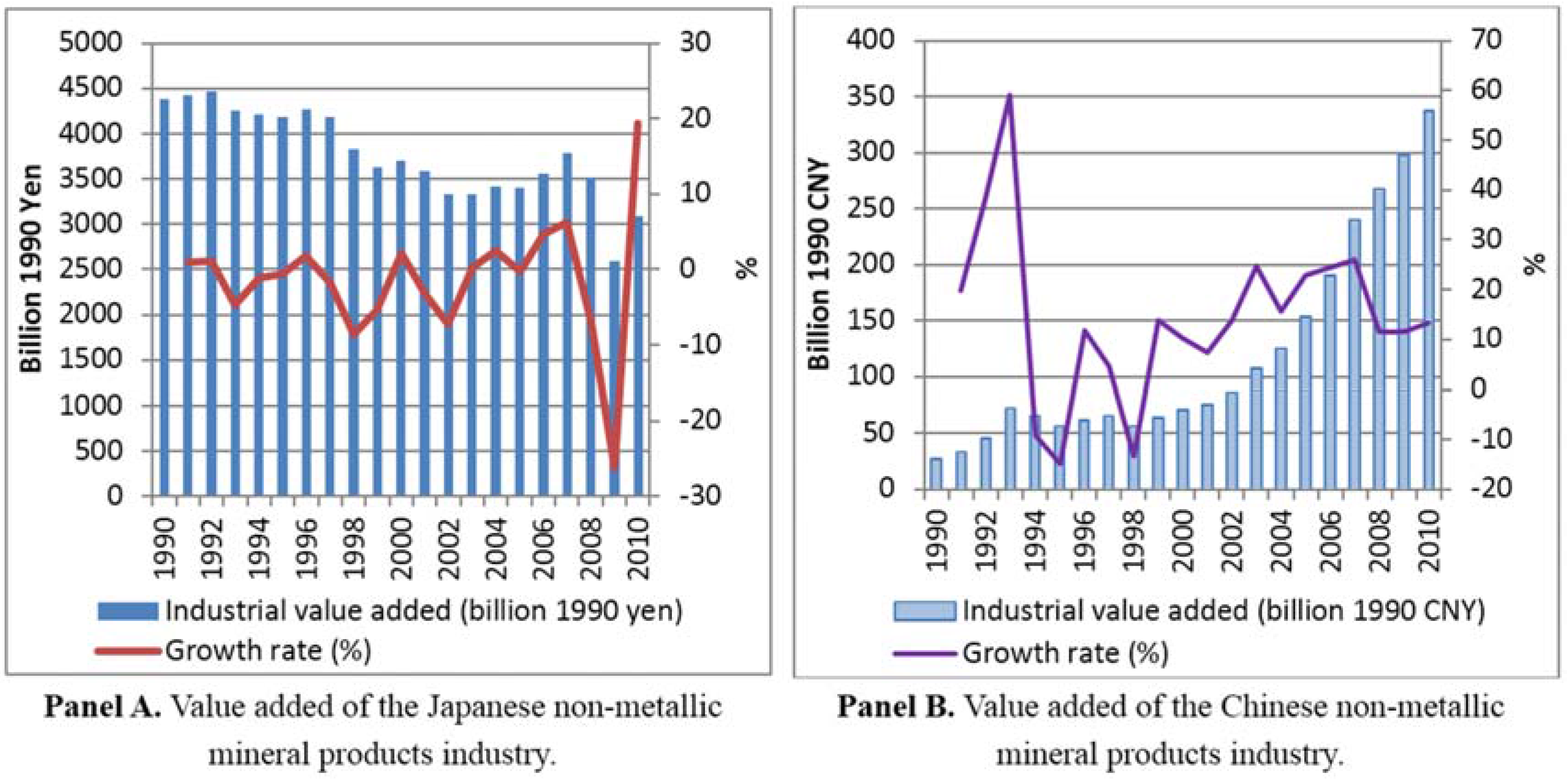R&D intensity level of the Chinese non-metallic mineral products industry was much lower than that of Japan’s. The average growth rate of R&D-sales ratio in the Japanese non-metallic mineral products industry was 0.82% during 1990–2010 (Figure 4. Panel A); however, the value was −0.14% in the Chinese non-metallic mineral products industry (Figure 4. Panel B).