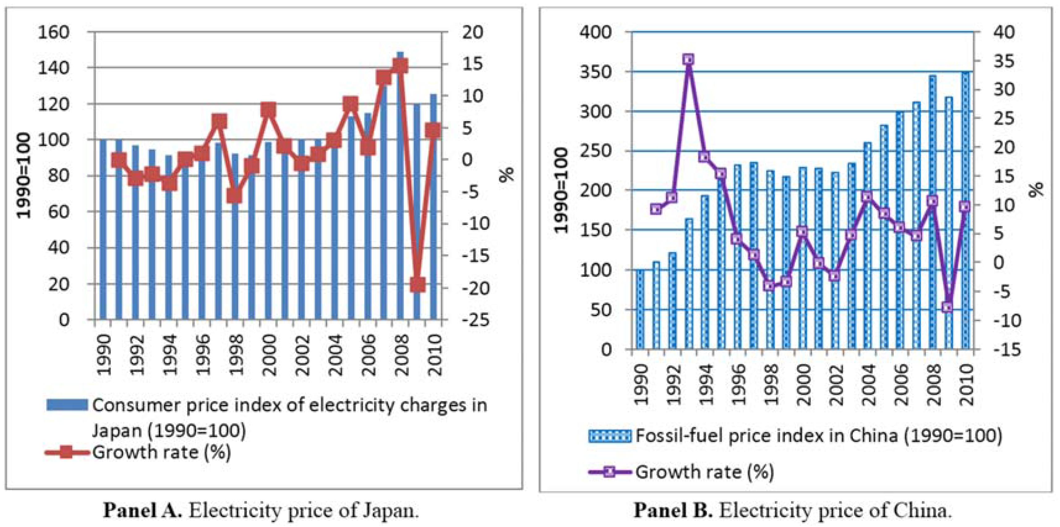 Elkhafif [56] showed that a substantial part of energy conservation came from the higher aggregate price of energy by estimating an industrial energy demand model for the province of Ontario. For the case of China, Yuan et al. [57] proved that higher energy price would decrease energy consumption in the Chinese industrial sector. Generally, price indexes are used for the measurement of price changes. Electricity price of Japan was relatively stable over the years, of which the average annual growth rate was 1.4% (Figure 3. Panel A). Due to the limitation of data, we use fossil-fuel price index as the electricity price in China. Similar method of data handling has been used by several studies such as Lin et al. [58], Lin and Ouyang [59]. As can be seen from Figure 3 Panel B, the average annual growth rate of fossil-fuel price index in China was 6.80% during 1990–2010. However, energy prices in China were still regulated or controlled by the government, and there existed large amounts of subsidies [60].