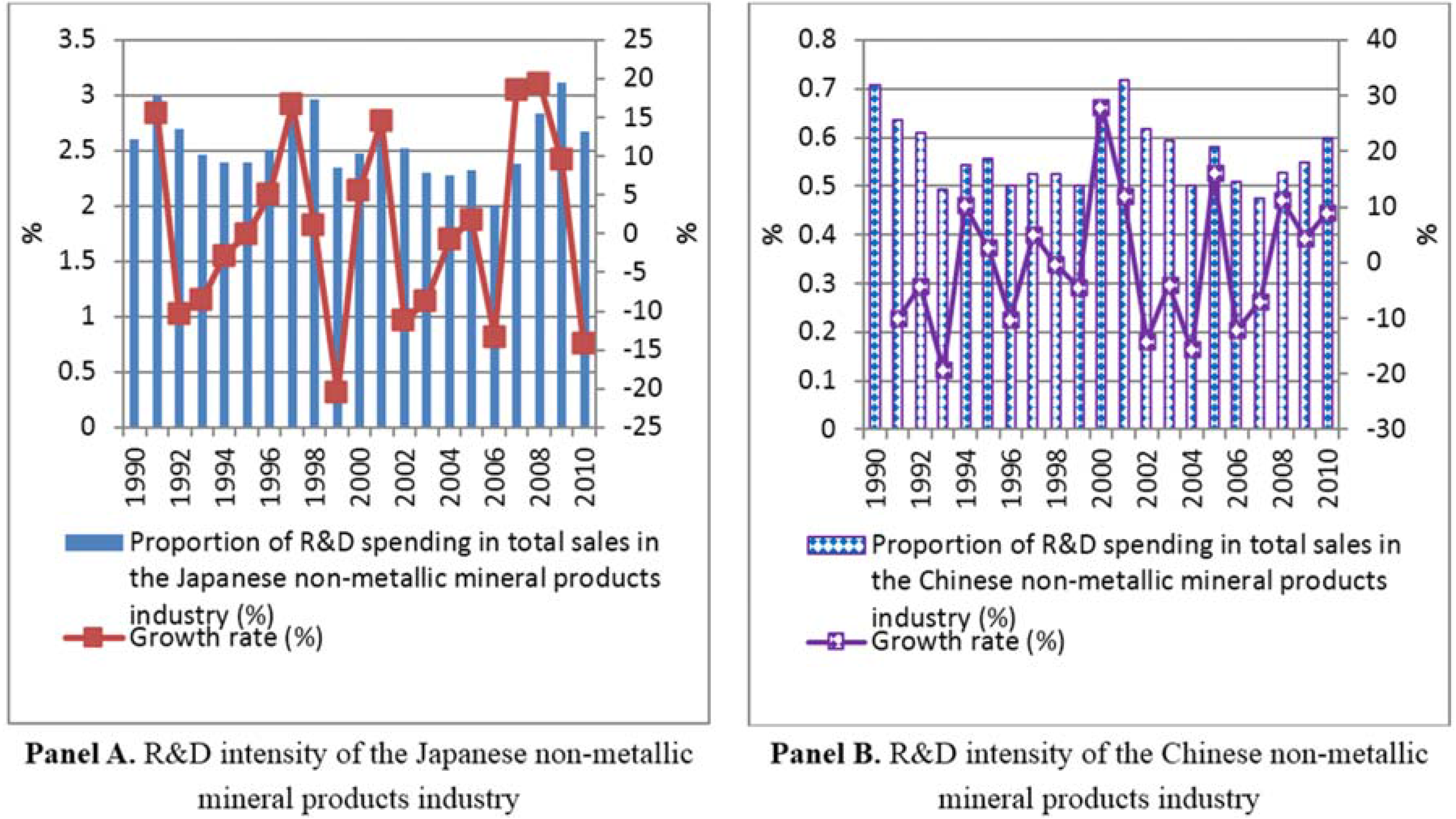 R&D intensities of non-metallic mineral products industries in Japan and China.
