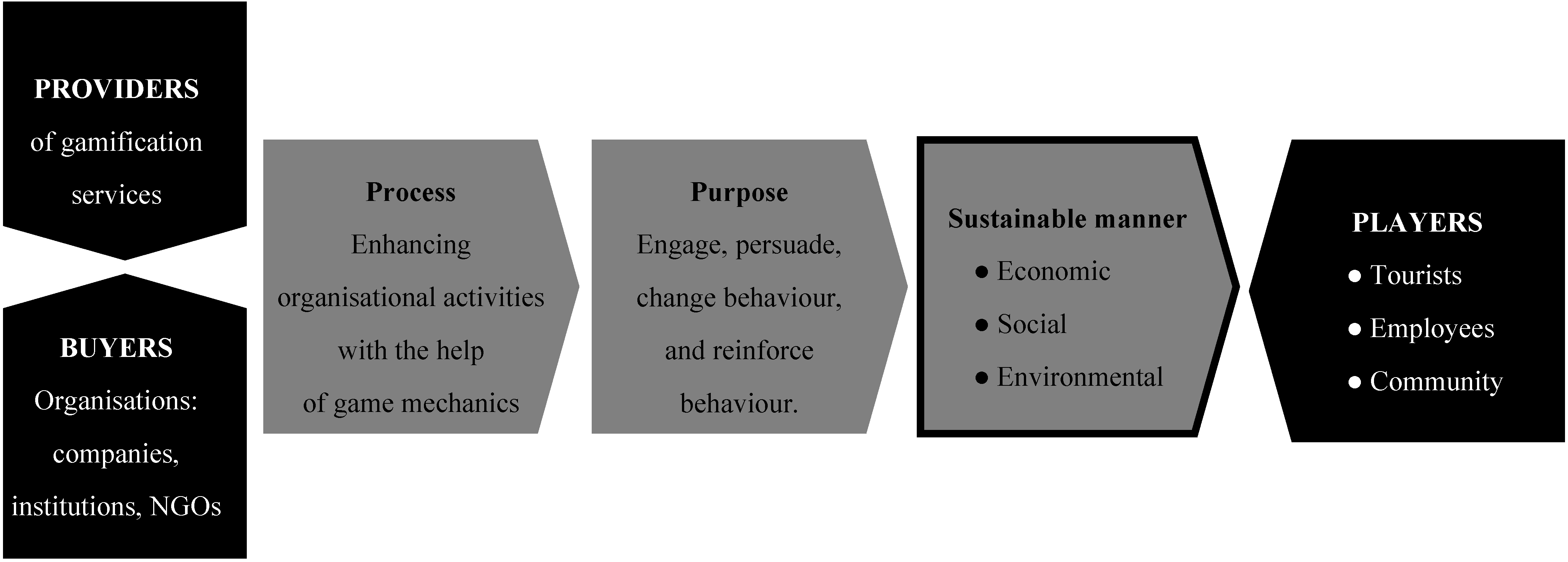 In order to draw connections between the main stakeholders and to visually represent the value of gamification for sustainable tourism, an interpretative framework was developed (see Figure 1). The initiators of gamification in tourism are the providers of gamification services from ICT and business consultancy industries. The buyers of gamification services are the organisations with an interest in the tourism industry, like companies (hotel chains, restaurants, tour-operators), local institutions (mayor’s office, tourism ministries, public employment offices) and NGOs (concerned with social, environmental and political issues). The providers and the buyers are the developers of the phenomenon. The purpose behind this endeavour is to engage and persuade the players (tourists, employees, community) to change or reinforce their behaviour through enhancing specific organisational activities (marketing, human resource management, public relations), a process carried on with the help of game mechanics (instant rewards, feedback, levels and missions, ranks and badges, etc.). The challenge is to do all this in a sustainable way, taking into account economic, social and environmental components.