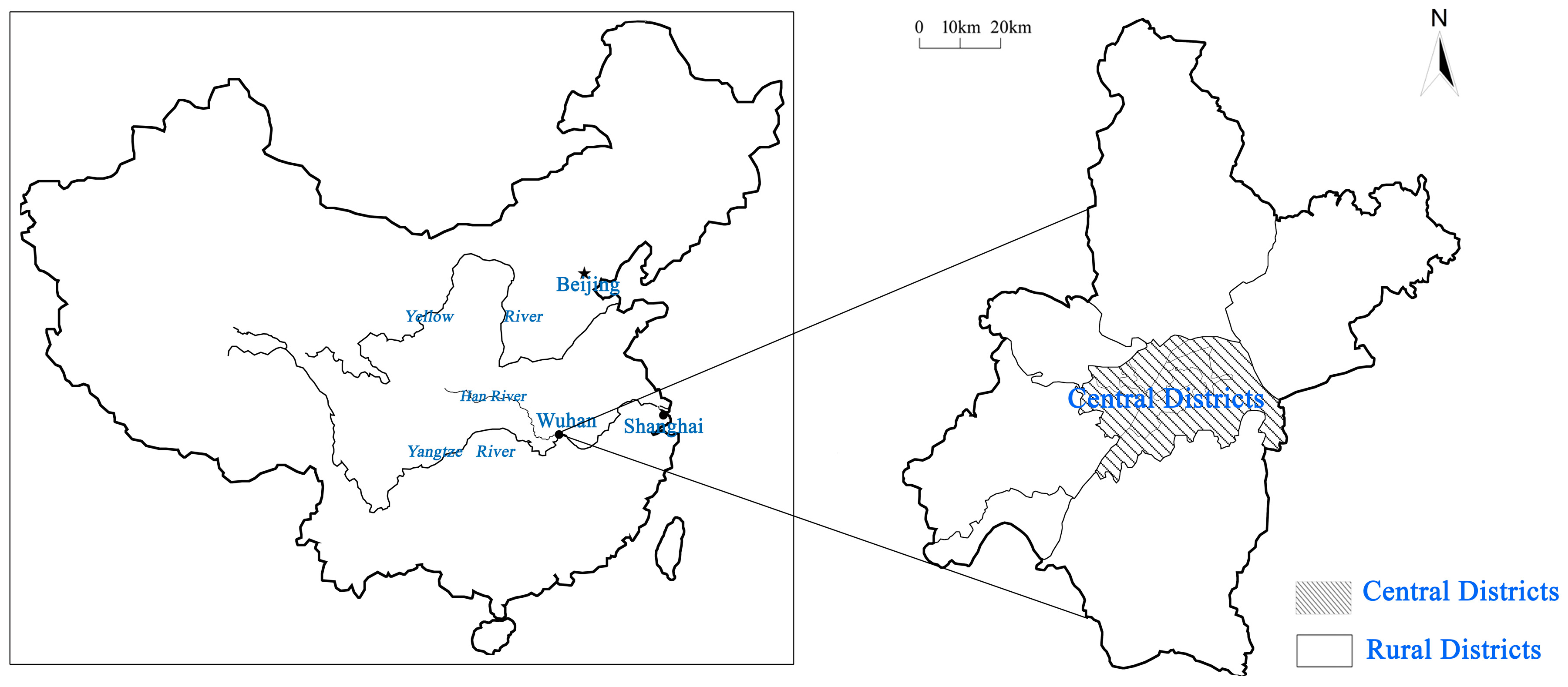 Wuhan is the largest city in central China, it located at the intersection of the middle reaches of the Yangtze River and its largest tributary Han River. Having a population of eight million, Wuhan has direct jurisdiction over seven central districts and six rural districts (Figure 1). The whole area of the city is nearly 850,000 hectares, 575,000 hectares of them are farmland. Owing to the acceleration of the industrialization and urbanization process [38], more than 5000 hectares of farmland are converted into urban land every year. Moreover, the excessive use of pesticides and chemical fertilizers has exerted a great threat on the farmland environment. The decline in quantity and degradation in quality of farmland have brought serious challenges for farmland management [39,40]. Many of the values associated with these changes are difficult to quantify in monetary terms and often consumed by people in terms of quasi-public goods. In fact, protecting farmland has been one of the most important land administration issues not only for the local policy makers but also for the Chinese central government [41].