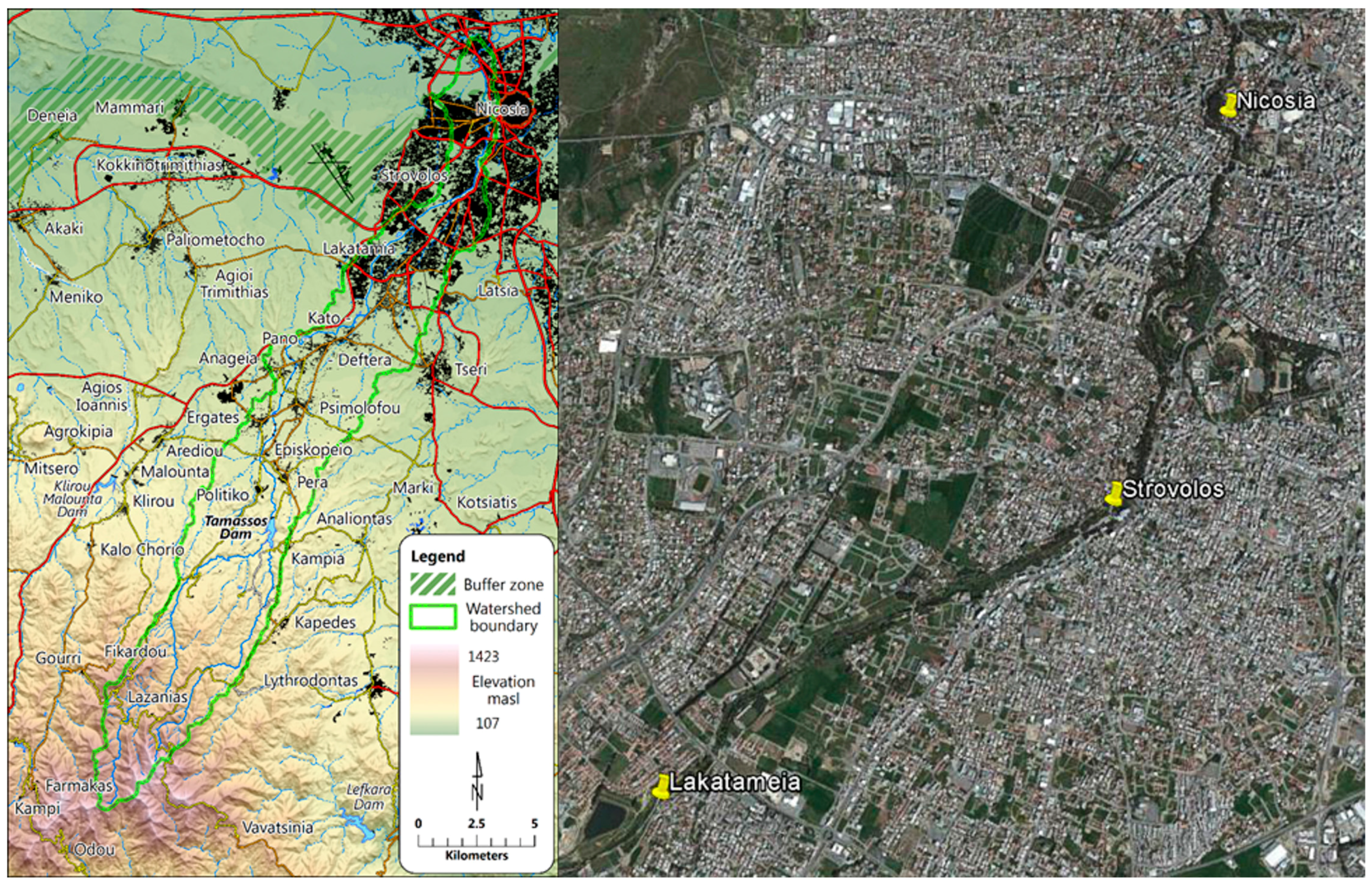 The Pedieos River Basin with the Tamassos Dam in the foothills and the urban area of Nicosia downstream (left); google earth image of the linear park in the urban areas of Nicosia and Strovolos (right).