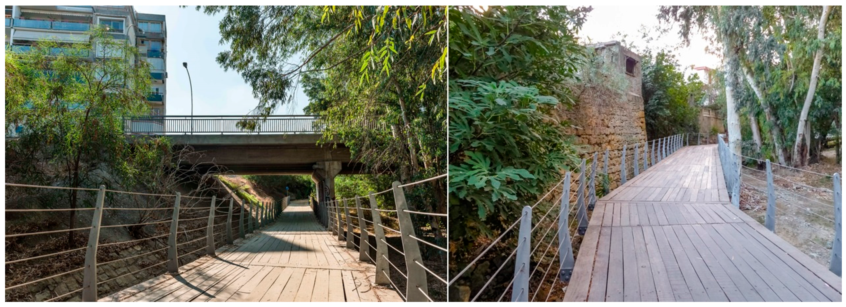 The linear Pedieos Park, which was constructed between 1999 and 2014, runs for 9.5 km along the bed of the river. The park begins in the center of Nicosia city and passes through the adjacent municipalities of Strovolos and Lakatameia. The park is narrow and shaded by large eucalyptus (Eucalyptus camaldulensis and Eucalyptus gomphocephala), pine (Pinus brutia), and palm trees (Phoenix dactylifera and Washingtonia filifera) along its first stretches in Nicosia (1.1 km), where it passes through a small forested area (1.4 ha) with a café. The path gains gradually in width in Strovolos, where it runs along the back of the gardens of the Presidential Palace. After about 3 km from its start in the city center, the path splits into a separate lane for walking and cycling. The river becomes wider and the path more open and less shaded. Suspended, steel-framed wooden pathways have been constructed at the narrowest parts of the river and inside the bridges that cross busy roads (Figure 2). Plans have been prepared to extend the park by 14.2 km, through the suburban and rural surroundings of Nicosia, all the way to the Tamassos dam at the foothills of the forested mountains (Figure 1).