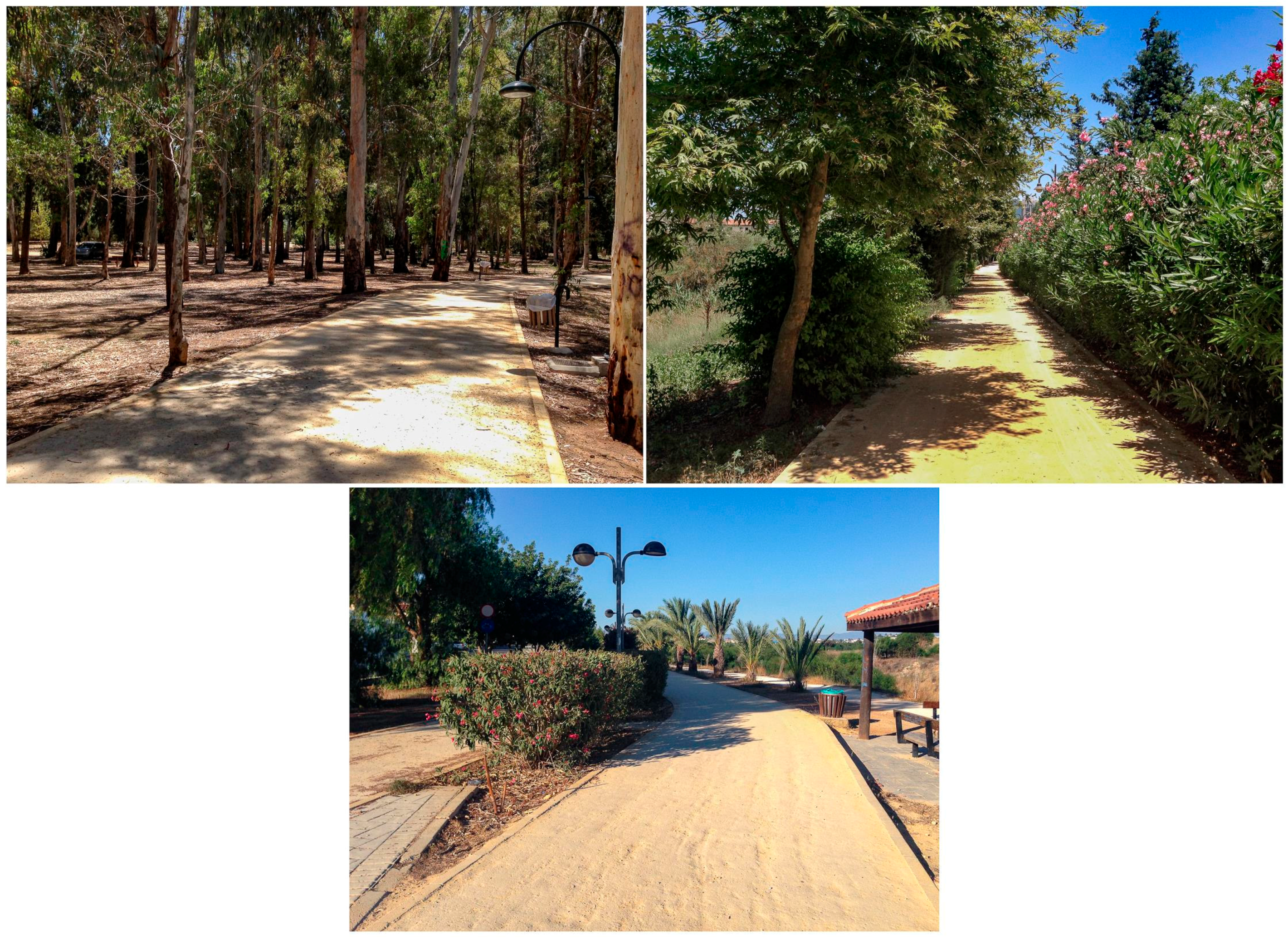 The field survey was deployed for 28 days between 7:00 a.m. and 10:00 a.m. and 18:00 p.m. and 21:00 p.m., on both weekdays and weekends, during June and July 2014. At these times of the day, the park attracts most of its visitors. Government organizations and most businesses in Cyprus do not have long lunch breaks and people tend to remain indoors during the hottest parts of the day. As thermal comfort perceptions may be sensitive to vegetation cover [5,33], the field survey took place at three different locations in the linear park, representing high vegetation (Nicosia), medium vegetation (Strovolos), and low vegetation cover (Lakatameia) (see Figure 3). All passing park users were approached and invited for interviews, while anonymity and confidentiality was ensured. All respondents were older than 15 years old. In total, 305 questionnaires were completed.
