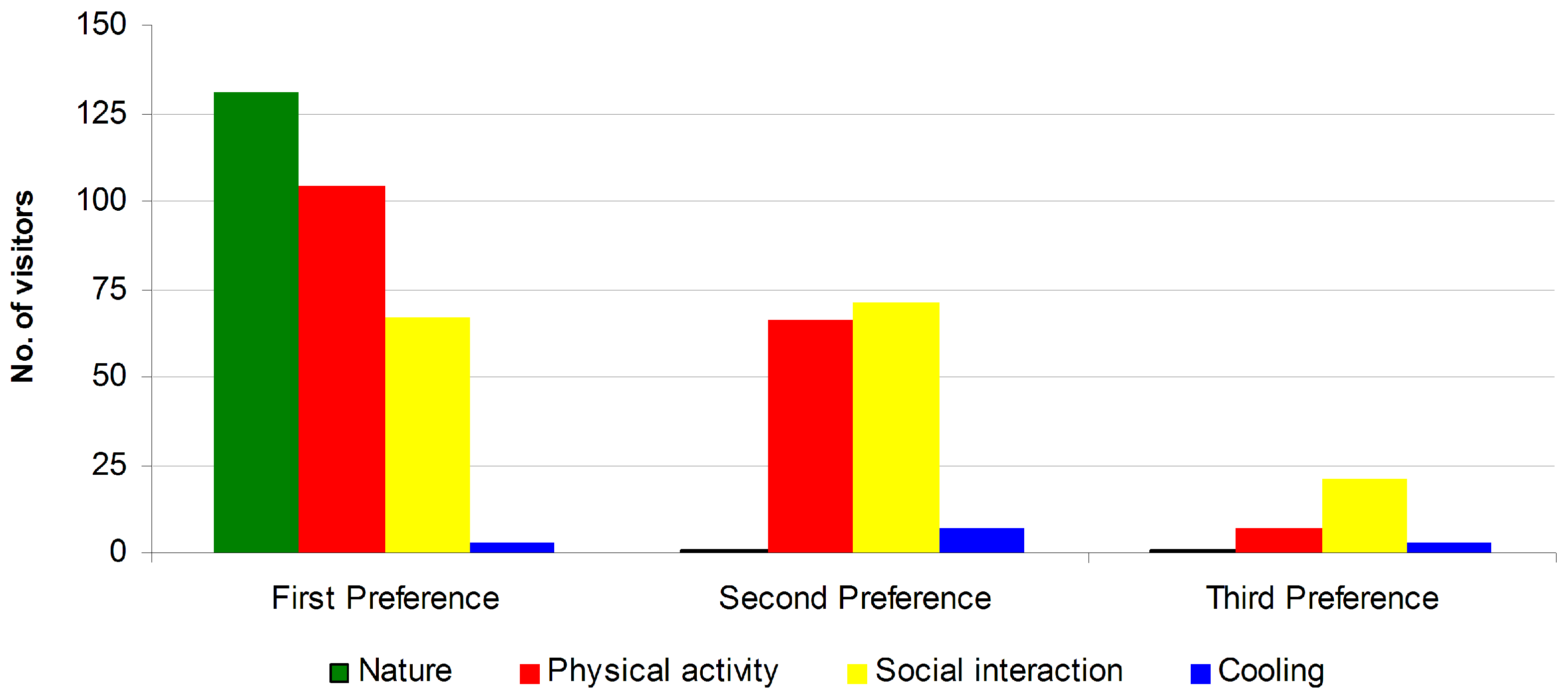 Respondents were asked in an open-ended manner to identify the three most important services of urban parks. All visitors specified at least one main service of urban parks, while 145 and 32 visitors identified a second and a third service, respectively (Figure 5). Enjoying nature had a significant place in the eyes of the park users since 43% mentioned this as the first service. Engagement in physical activities such as walking, jogging, and cycling, was considered the most important service by 34% of the visitors, while it was mentioned as a second or third benefit by 24% of the park users. The provision of a venue for socializing, interacting, and relaxing, including activities such as meeting friends and other people, was mentioned by 22% of park users as the first benefit of urban parks. Only 1% of the Pedieos Park visitors considered cooling as a primary benefit and 3% of the park users mentioned it as their second or third choice.