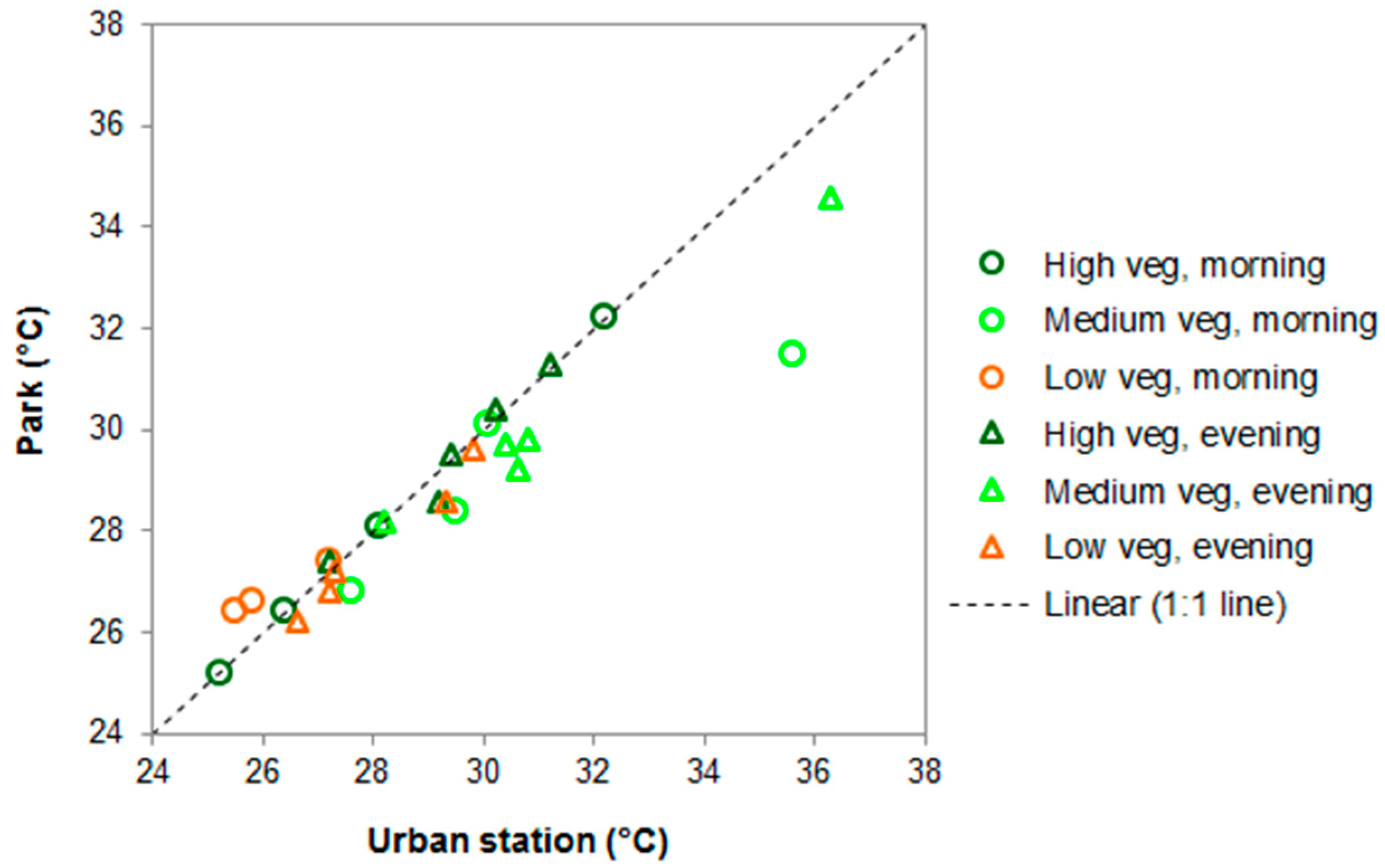 The measurements of the micrometeorological conditions in the park and in the built-up area near the park revealed a relatively low cooling effect of the urban park (0.5 °C). The highest differences were recorded in the park’s medium vegetation location, which was close to the urban climate station (Figure 6). Here, temperatures were on average 1.5 °C cooler at 8:30 a.m. in the morning and 1.0 °C cooler at 19:30 p.m. in the evening, compared to the temperature in the built-up area. In the morning, temperatures at the low vegetation part of the park were on average 0.2 °C higher than at the urban station, while temperatures were 0.8 °C lower in the shaded, high vegetation location of the park. However, the evening temperatures were 0.4 °C lower at the low vegetation location in the less densely built-up suburbs than at the urban station, while they were the same at the densely vegetated location in the city center. The cooling effect of the park was highest on the hottest day, when the temperature in the park’s medium vegetation location was 4.1 °C cooler at 8:30 a.m. in the morning (31.5 °C) than the temperature in the built-up area near the park (35.6 °C).