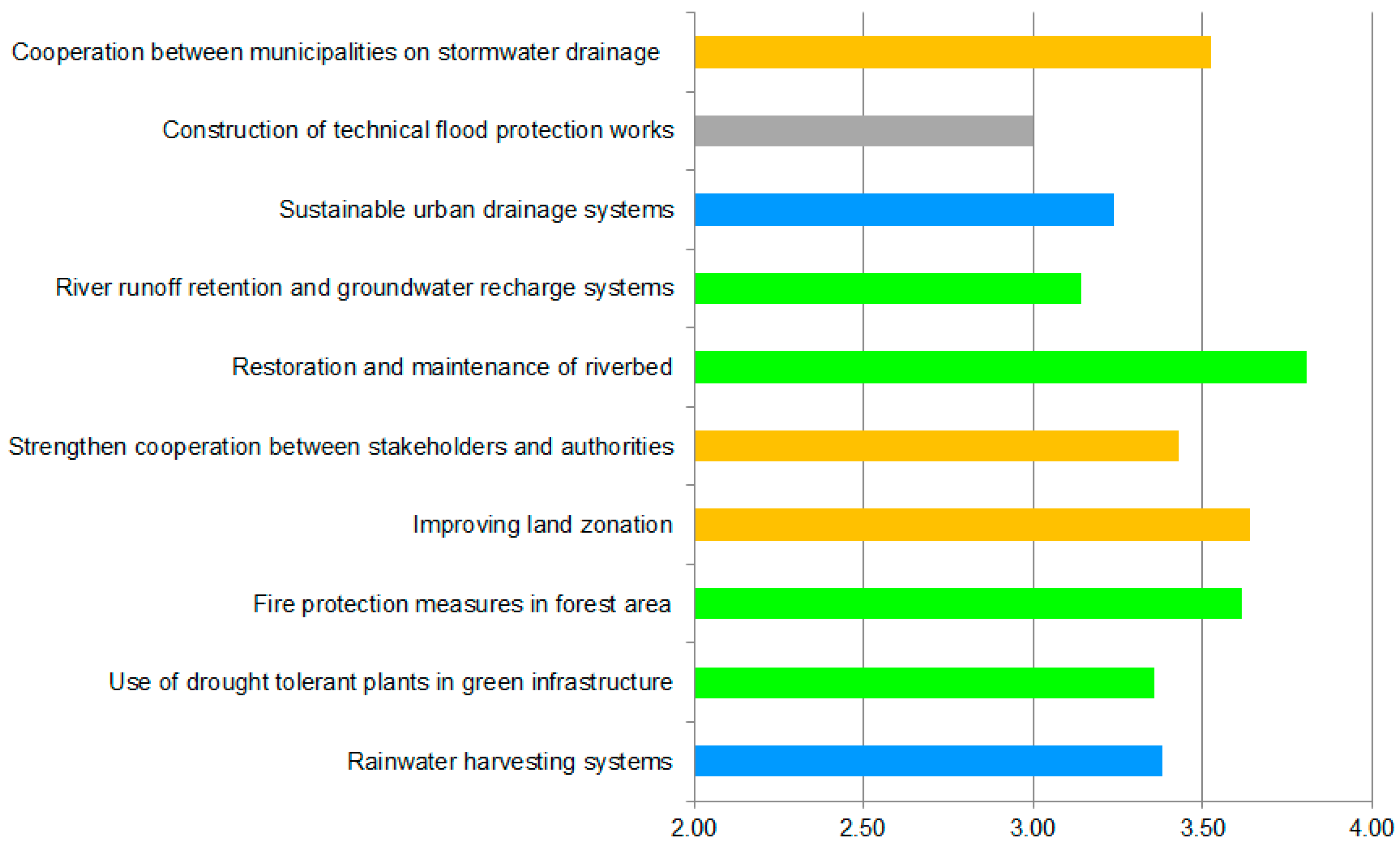 During the survey in October 2015, 84 users of the linear park, both women (56%) and men (44%), reviewed and scored ten climate change adaptation options for reducing flood risk. Even though the river was not flowing at the time, many people remembered the previous years’ (2014) storm event, which flooded several parts of the cycling path. Nature-based solutions and managerial options were well perceived by park users as they received the highest score in terms of importance (Figure 7). Grey approaches to adaptation were also considered important but the overall average score was lower than the other two categories of options. The green option, restoration and maintenance of the riverbed, was the most important adaptation option according to park users’ preferences (3.8), while the grey option, construction of technical flood protection works, was the least popular option (3).