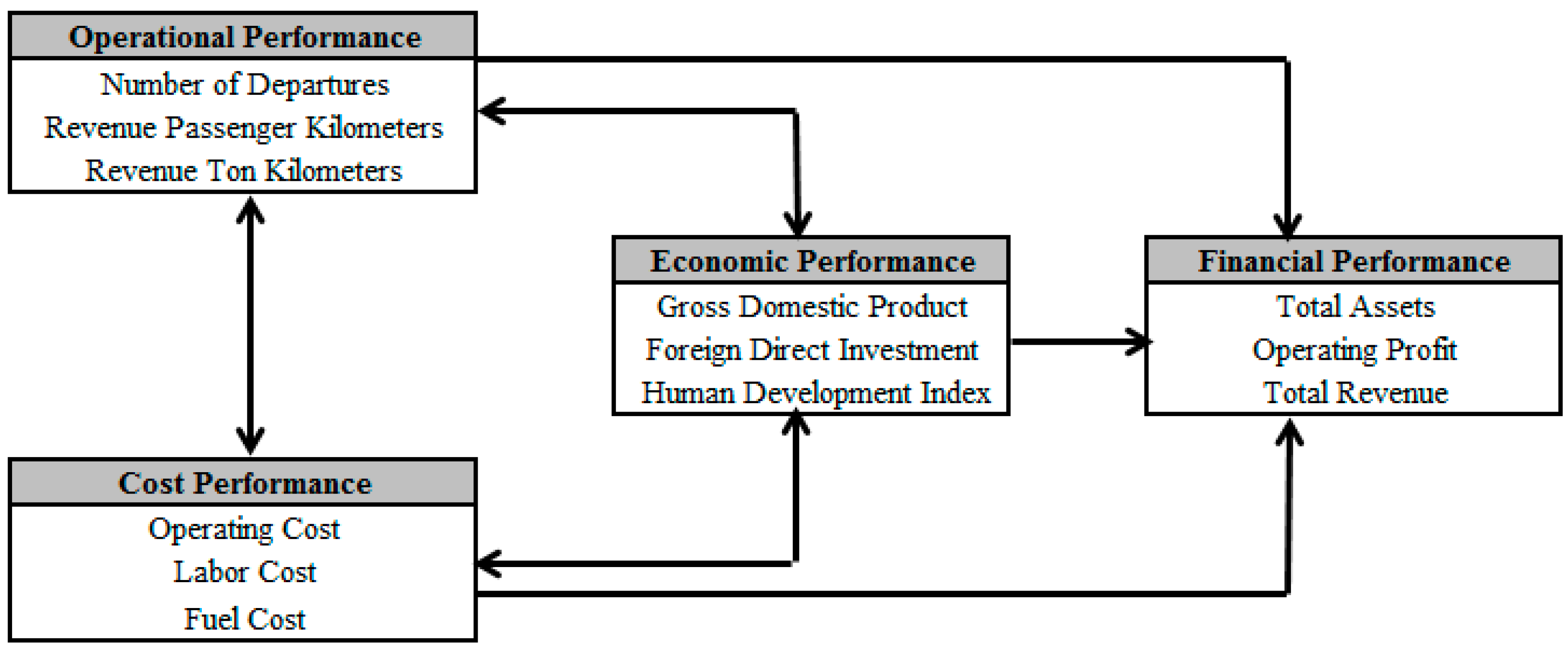Operational performance measures have been broadly applied by a good number of corporations since the early 1990s to measure current performance, identify requirements needed to enhance performance, and make the achievement of far-fetched strategic goals possible [53]. Recently, operational performance measures have been able to gain a global prevalence as myriad organizations and companies around the world have shifted their attention and reliance from the traditional method based mainly on financial performance measures to a range of non-traditional value indices [54]. Revenue passenger kilometer, revenue tone kilometer [55,56], and number of departures [6] are the main operational performance indicators in the airline industry. In our study, we define operational performance with a combination of these three indicators. Logically and empirically operational performance has an impact on financial performance and the relationship between economic performance and operational performance is confirmed by previous studies [57]. Therefore, we considered these relations in the research model and tested the following hypotheses: