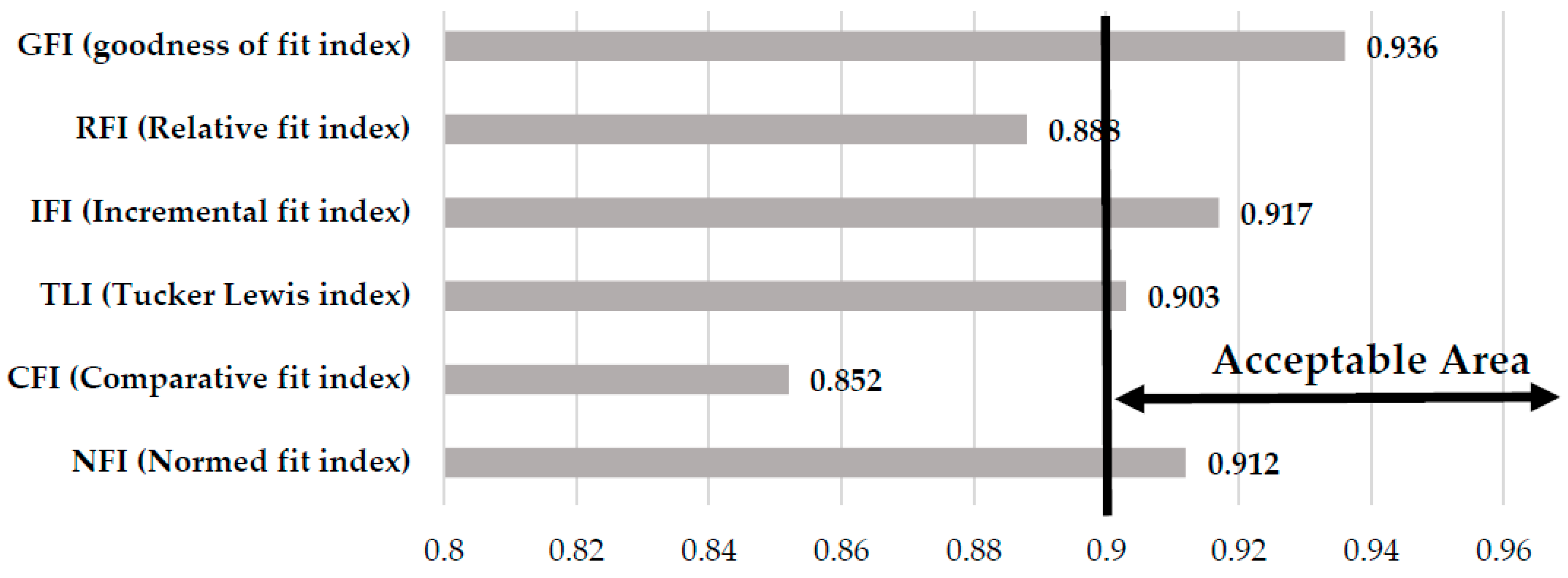 Figure 4 represents the results of model fitting based on the SEM approach. The values of GFI, IFI, TLI, and NFI are within the acceptable range. Therefore, the current model is fitted for our data at the 5% significance level.