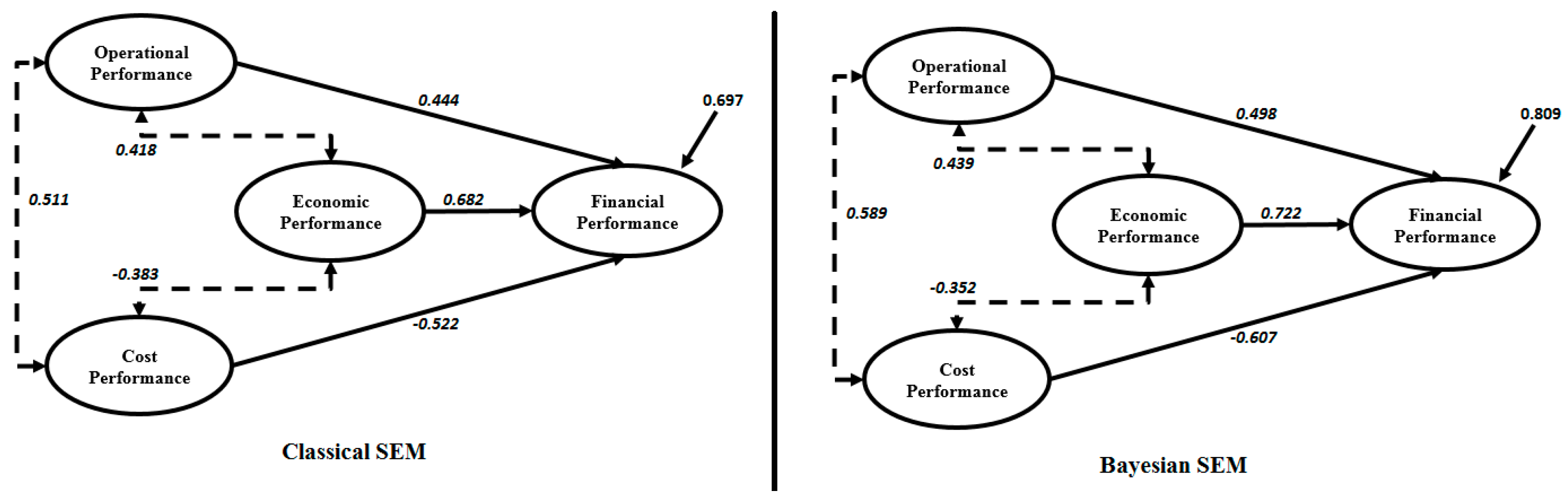 Based on Figure 5, the estimated structural equations were obtained that addressed the relationship between the performance index with economic performance, operational performance, and cost performance for the Classical-SEM and Bayesian-SEM, respectively given by