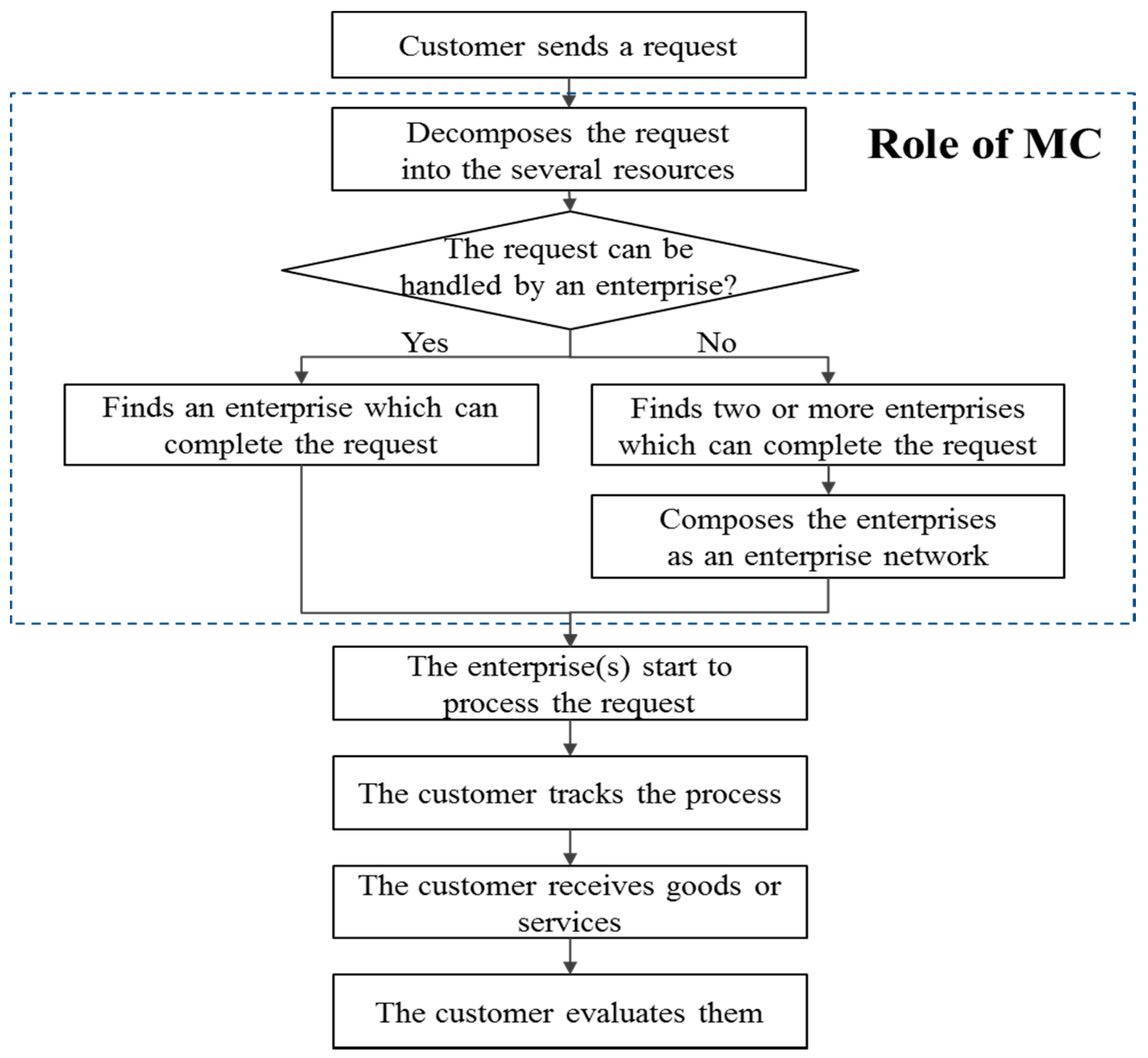 In this sense, various enterprises participating in CM can share manufacturing resources and cooperate with each other to produce highly-customized manufacturing services even though the services are too large or too complex to handle for one enterprise [5]. In addition, CM can deliver reliable, high-quality, and on-demand manufacturing services for the whole lifecycle of manufacturing, such as design, production, testing, and logistics [6], by enabling the enterprises to freely access every manufacturing service in the manufacturing cloud (MC), without certain expertise in the management of resources used. That is, MC is a main component of cloud manufacturing to utilize the manufacturing process in CM. Thus, we use the terms CM and MC separately to distinguish the manufacturing model (CM) and platform (MC), clarifying the manufacturing process in CM. The MC is a manufacturing platform made up of universal and renewable manufacturing resources with flexibility [7]. In the MC, diversified manufacturing resources can be intelligently sensed and connected into the wider Internet, and automatically managed and controlled by means of the Internet of Things (IoT) and related technologies (e.g., radio frequency identification (RFID), wireless sensor network, embedded system, etc.). Then those are virtualized and encapsulated into the MC, which means they are enrolled in the MC with identification factors (e.g., name, inventory level, location). They can be accessed, invoked, and deployed by means of cloud computing technologies, virtualization technologies, and service-oriented technologies after that. MC automatically analyzes customers’ requests to estimate the required resources and the amount of them to complete the requests. After the estimation, MC finds the appropriate enterprise(s) that could successfully complete the request. If the request is so large that two or more enterprises are needed to complete the request, then MC composes the enterprise network for the request. The formal operation process to complete a customer request in MC is presented in Figure 1. As seen in Figure 1, if the request is too large for an enterprise to complete it (e.g., the request requires various resources or a lot of resources), MC finds and selects two or more enterprises and composes a network of enterprises [8].