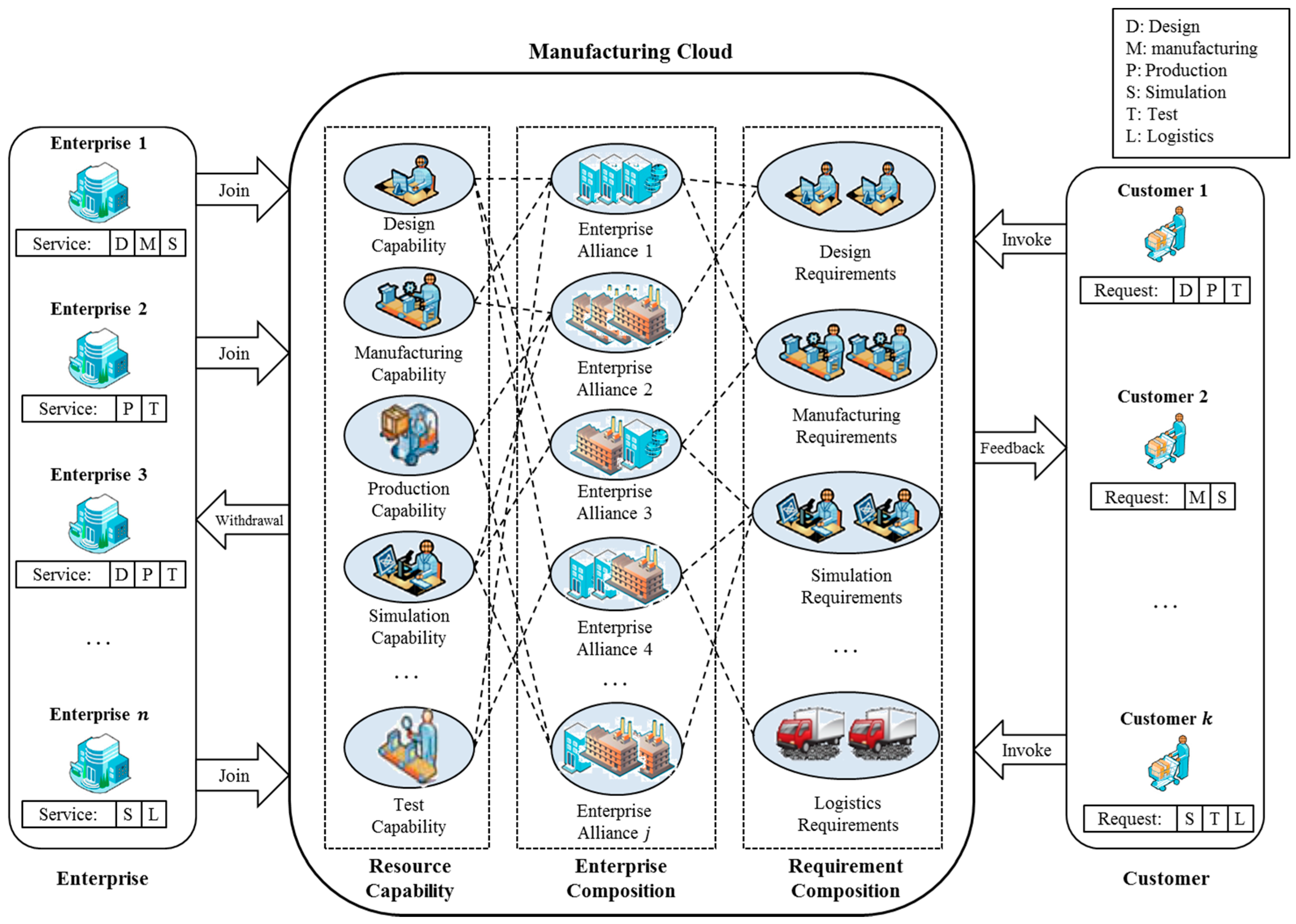 As an example of the operation process, suppose enterprises 1, 2, 3, … , n participate in CM as illustrated in Figure 1. Suppose that customer 1 invokes a request including resource D (design), P (production), T (testing), and this request is newly organized in the requirement composition layer as shown in Figure 1. For convenience, let the amount of every resource be 1. Then, the enterprise alliance that can handle the request from the customer 1 is one of {(enterprise 1, enterprise 2, enterprise 3), (enterprise 1, enterprise 2), (enterprise 1, enterprise 3), (enterprise 3), …}. For instance, (enterprise 1, enterprise 2) can handle the demand by sharing D (by enterprise 1), P, and T (by enterprise 2). This indicates that the request can be handled by two or more enterprises (N-to-one) or only one enterprise (one-to-one). Note that enterprise n is not included in any alliance because it does not have either D, P, or T. After an alliance (i.e., temporary production network) is decided to handle the request and the request is fully processed, the alliance is terminated.