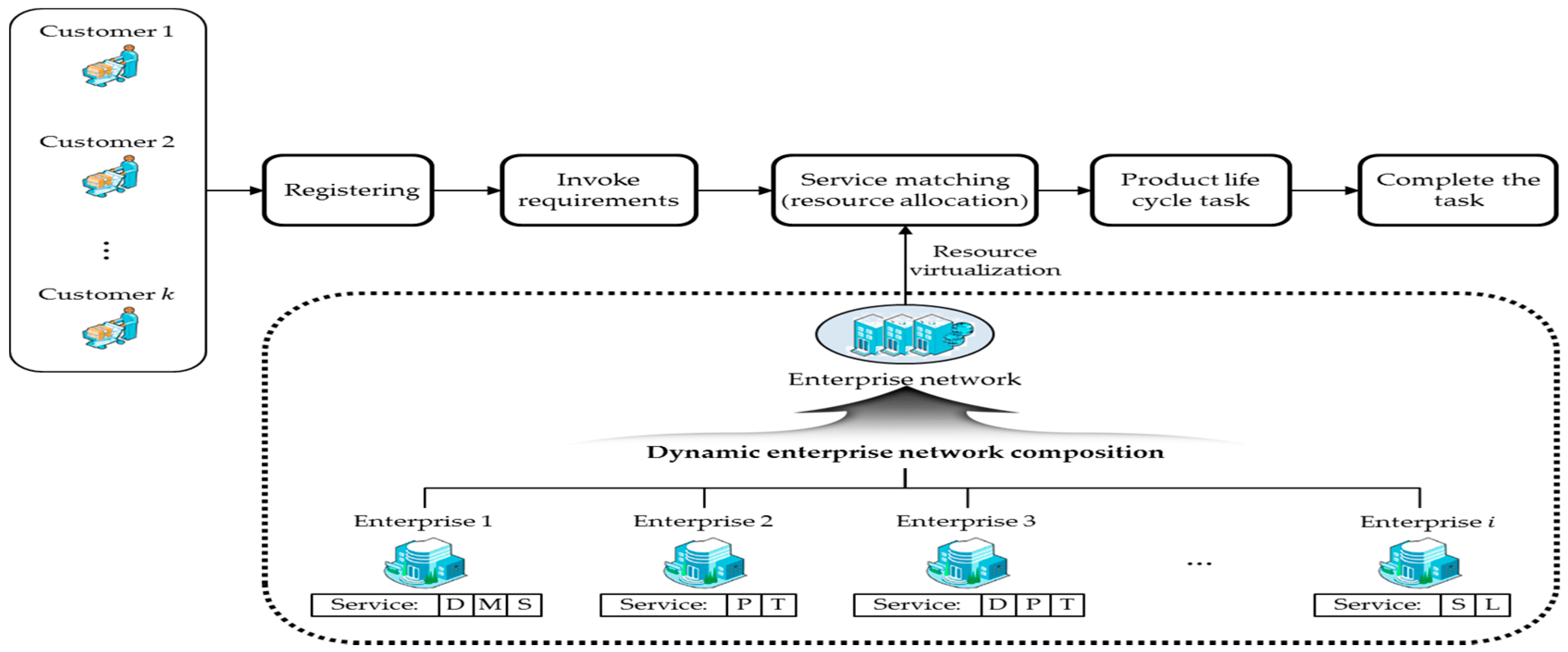 Figure 2 illustrates the whole life cycle process of CM [11]: First of all, enterprises contract with CM and participate in CM. This contract generates the participation contract cost. Once the enterprise takes part in CM, it is possible to collect the resource information of each enterprise, such as the amount of resources the enterprise currently reserves, which is virtualized and encapsulated in the MC. Customers participating in CM invoke requirements about the products or services they want and the requirements are reorganized to be recognized as demands in CM. Types of resources, due dates, the amount of resources, and so forth, are included in the requests. After that, customer demands are matched with the adequate manufacturing service in the MC considering the information about the resource capabilities of each enterprise. The type of matching requirements and services could be either one-to-one (one enterprise is assigned to the service of one customer), N-to-one (two or more enterprises are assigned to the service of one customer), one-to-N (one enterprise is assigned to the service of two or more customers), or N-to-N (two or more enterprises are assigned to the service of two or more customers). N enterprises compose a temporary production network for one-to-N and N-to-N cases, while there is no need to compose the network for one-to-one and N-to-one cases. Finally, some enterprises in CM may leave CM, which generates a contract cancellation cost.