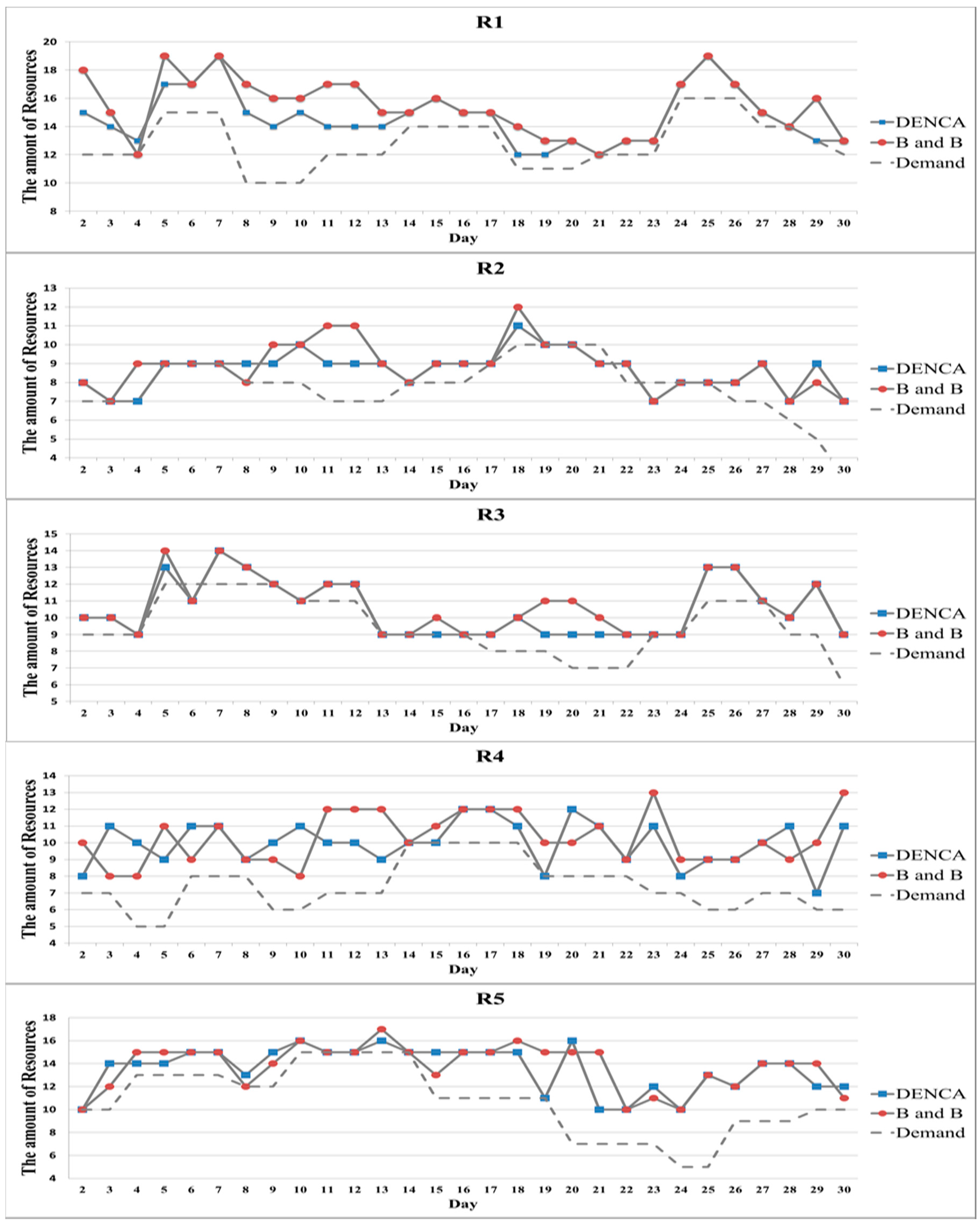 As shown in these figures, the enterprise networks constructed through both the DENCA and B and B algorithms can handle the demand without any loss for each resource. In other words, the amounts of resources that the enterprise networks have are higher than the amounts of required resources (i.e., demands) for the entire 30 days. The difference between the enterprise networks derived from the DENCA and B and B algorithms is that the former prepares more resources than the latter, which might cause resource waste (unnecessary expense). Readers see that most red circle points (derived from B and B) are located above the blue square points (obtained by DENCA) and dotted lines (actual demand) in the figures.