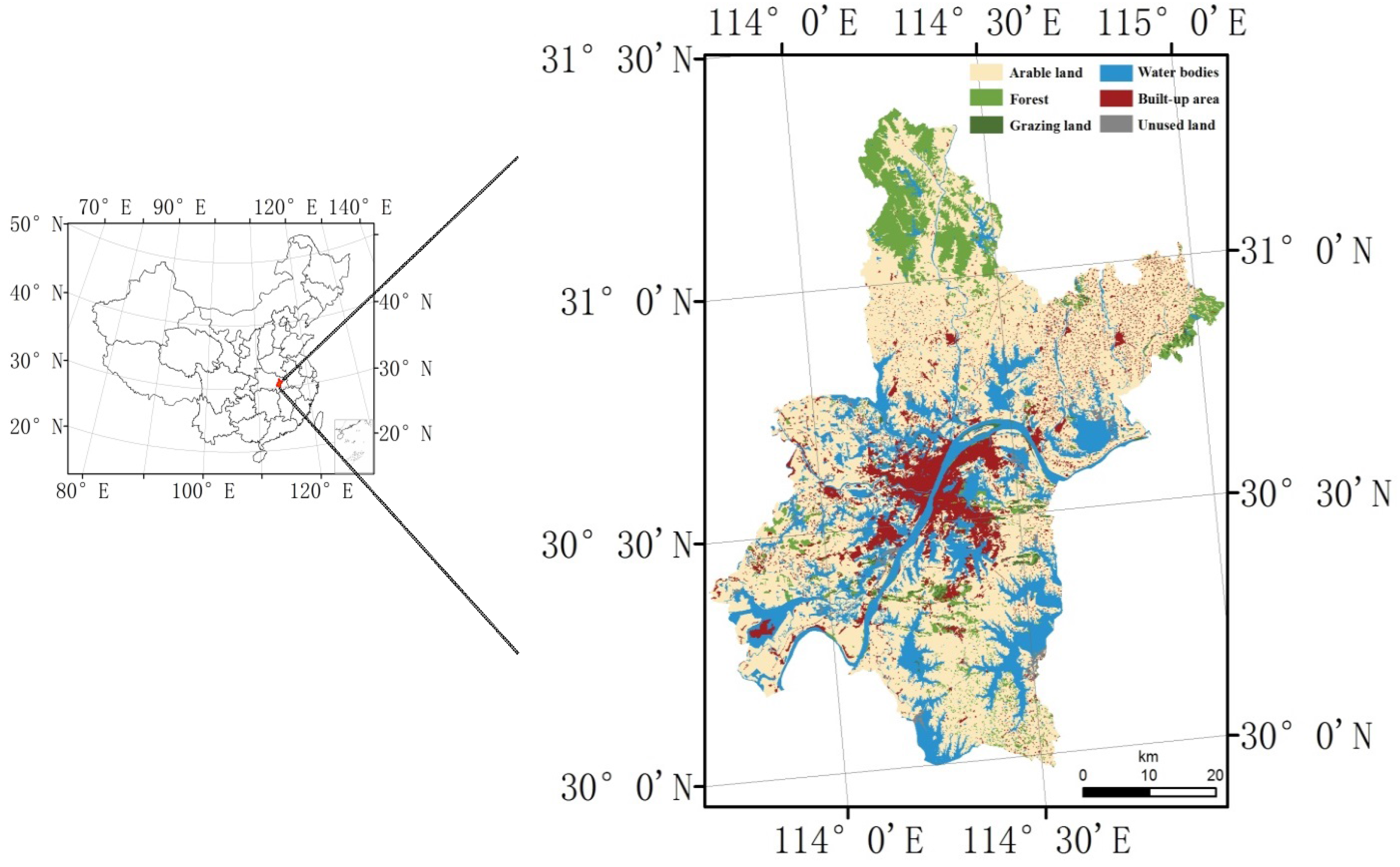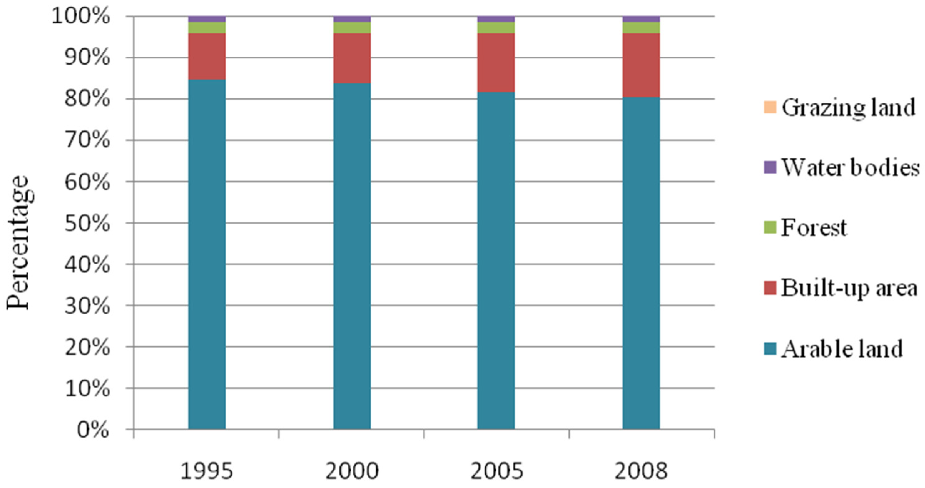 From the perspective of land use structure, nearly 59% of Wuhan’s land area was covered by arable land in 2008, which is about 5000 km2. It includes paddy fields and irrigated dry soils covering about 3200 km2 and 1800 km2, respectively. Water bodies as well as forests make up about 30% of the region in total. Built-up area occupies approximately 10%, comprising urban areas, rural settlements, separated industrial areas, roads and wharfs, and it is still sprawling fast by seizing arable land. Grazing land and unused land, the latter involving swamps and bare ground, are the two types that are difficult to see in the city: each type covers less than 1% of the area, respectively (Figure 1).