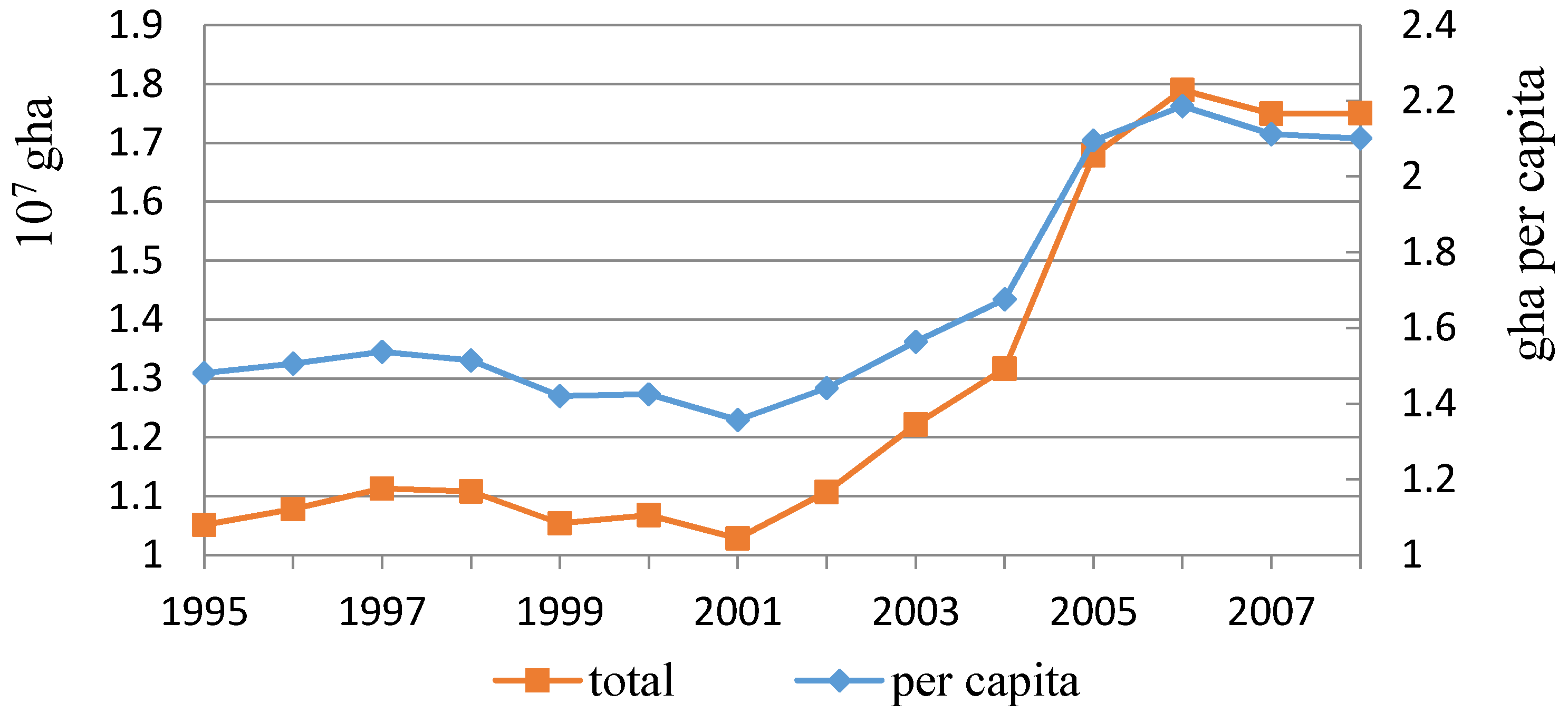 The ecological footprint accounts of Wuhan show a fluctuating, increasing trend, implying that the resource consumption in the city generally grew during the studied 14 years. As the population stably grew from 7.1 million in 1995 to 8.33 million in 2008, the ecological footprint per capita changed, keeping pace with the variations of the total amount. It increased from 1.48 gha per person to 2.10 gha per person, with only a slight decrease during 1997–2001 and 2006–2008, respectively (Figure 2). The demand for biological resources and energy in Wuhan went down to its minimum at 1.36 gha/capita in 2001 and then increased quickly to its peak at 2.19 gha/capita in 2006.