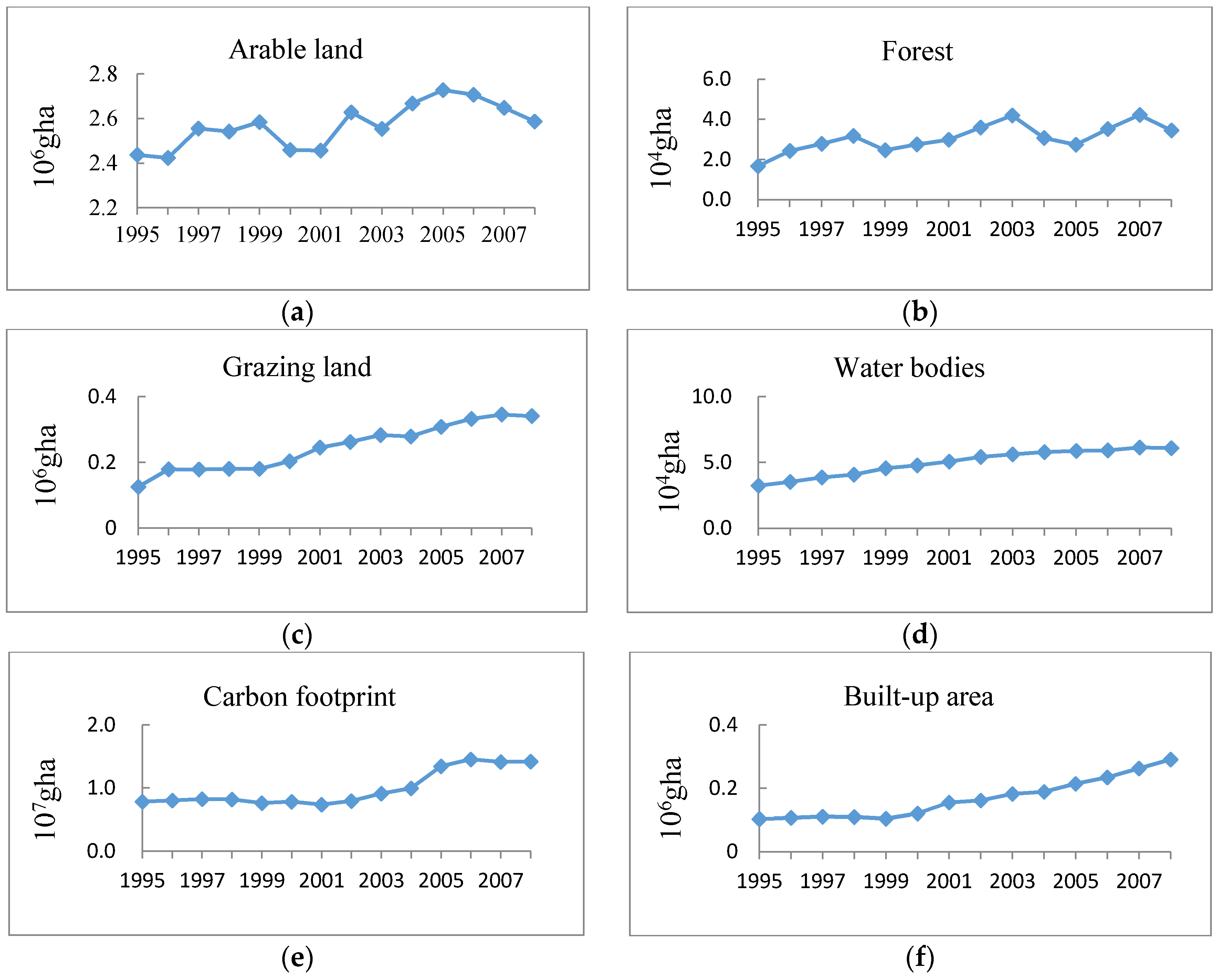 Ecological footprint evolution of corresponding biologically productive land (1995–2008): (a) Arable land; (b) Forest; (c) Grazing land; (d) Water bodies; (e) Carbon footprint (carbon uptake land); (f) Built-up area.