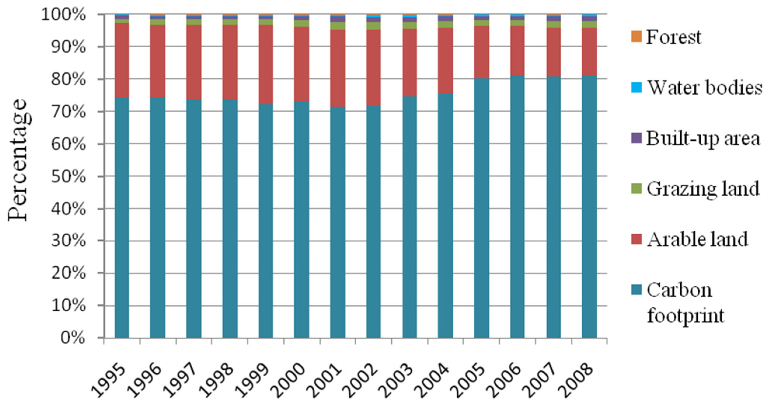 The component analysis of biologically productive land types in the ecological footprint gives a more in-depth look on the trends of the requirements for goods and services from the local inhabitants. During the 14 years, the carbon footprint held the most dominant portion of the all demanded, biologically productive land areas from beginning to end (Figure 4). Its percentage accounted for, at minimum, 71.4% in 2001 and, at maximum, 81.2% in 2006, and it showed a significant growth during 2002–2006. The arable land footprint also played a significant role in the total ecological footprint account. Its proportion stayed at a relatively high level, which was between 22.5% and 24.5%, during 1995–2002, but decreased considerably to 20.9% in 2003. It only reached 14.8% in 2008 after a five-year decline. In other words, even though arable land was the second-largest productive area that people needed to produce biological resources, its percentage was getting smaller in the overall ecological footprint from the year of 2003. The following components are the grazing land footprint and built-up area footprint, which were greater than the impact on water bodies and forest (Figure 3 and Figure 4).
