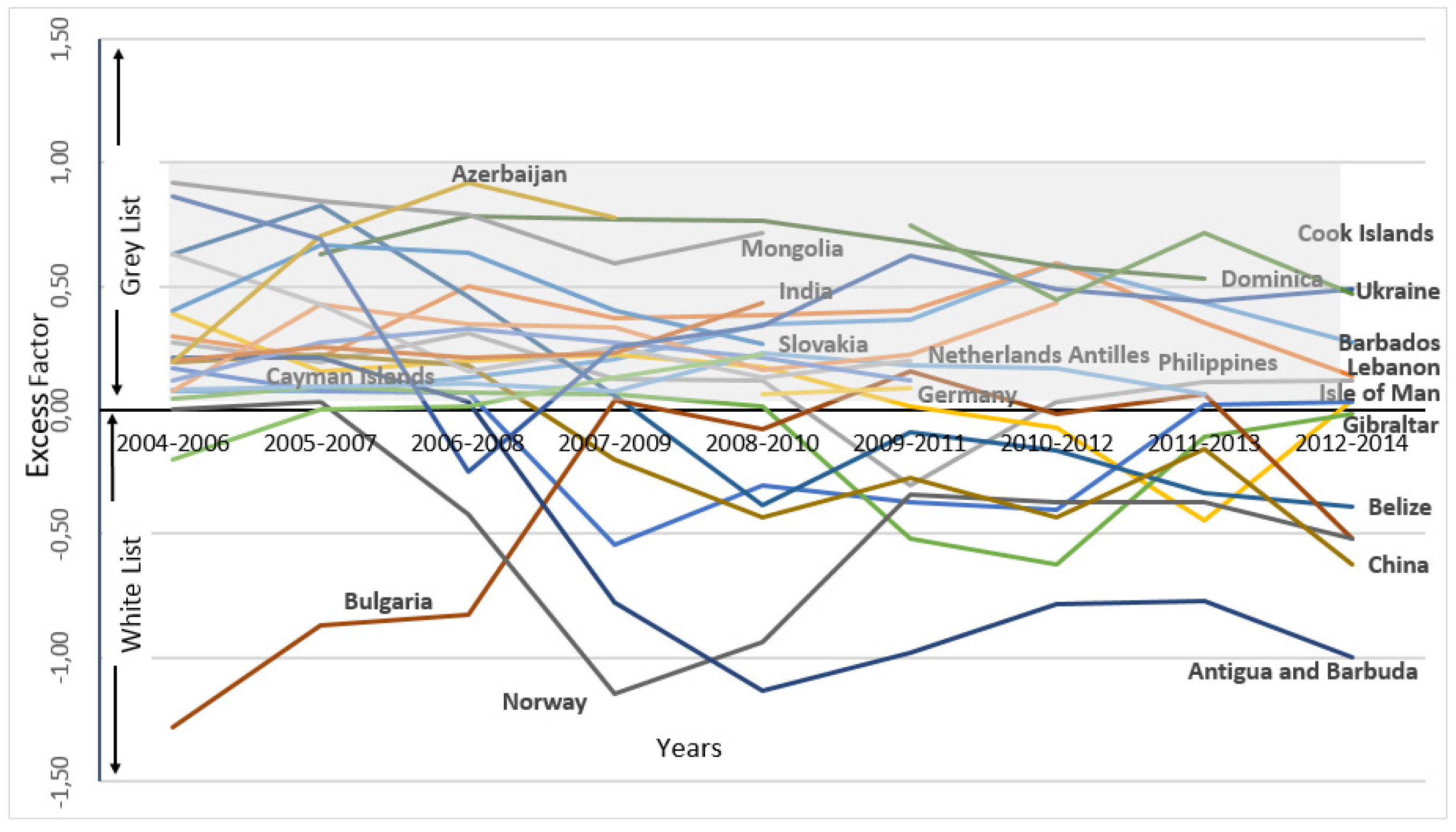 The change of excess factor of grey-listed flag states from 2006 to 2014.