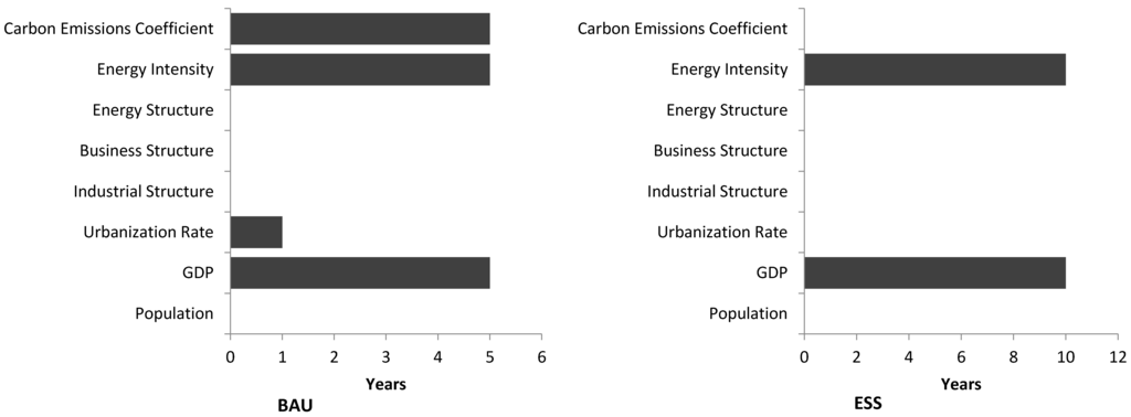 We assessed the impact of the carbon emission peak by changing the values of factors including the population, GDP, urbanization, industrial structure, business structure, energy structure, energy intensity and carbon emission coefficient in sequence from the high-speed development to the low-speed development. The calculation results showed that GDP, business structure, energy intensity and carbon emissions coefficient respectively led to the 32.28%, 10.63%, 14.6% and 24.77% drop in the value of the carbon emissions under the BAU. Thus, the four factors above are the main driving forces to reducing the carbon emissions according to the BAU. The calculation under the ESS showed the same results. The drops of 29.48%, 13.38%, 17.2% and 21.34% in the carbon emission are respectively contributed by the GDP, business structure, energy intensity and carbon emission coefficient. The same phenomenon also appeared under the ELS. The drop values of the carbon emission due to the GDP, the business structure, the energy intensity and the carbon emission coefficient are respectively 28.32%, 10.76%, 14.7%, and 14.32%. The consistent results indicated that same four main driving factors, namely GDP, business structure, energy intensity and carbon emission coefficient under the LCS. The values of carbon emissions fell by 20.82%, 8.05%, 11.7% and 11.57% respectively under the different scenarios.
