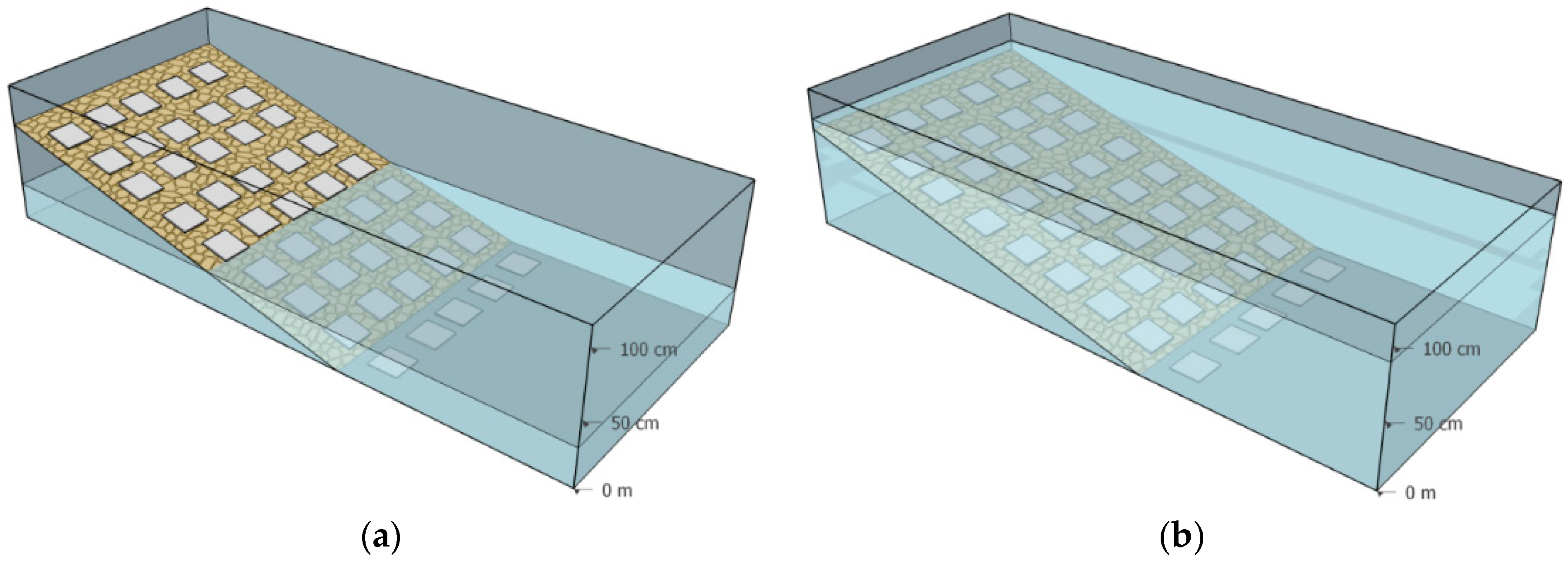 Schematic illustration of the experimental setup. Tiles were aligned in rows at a 10 cm height difference, whereby one row forms a littoral level. (a) The minimum water level was 40 cm above the ground; (b) The maximum water level was at 80 cm above the ground.