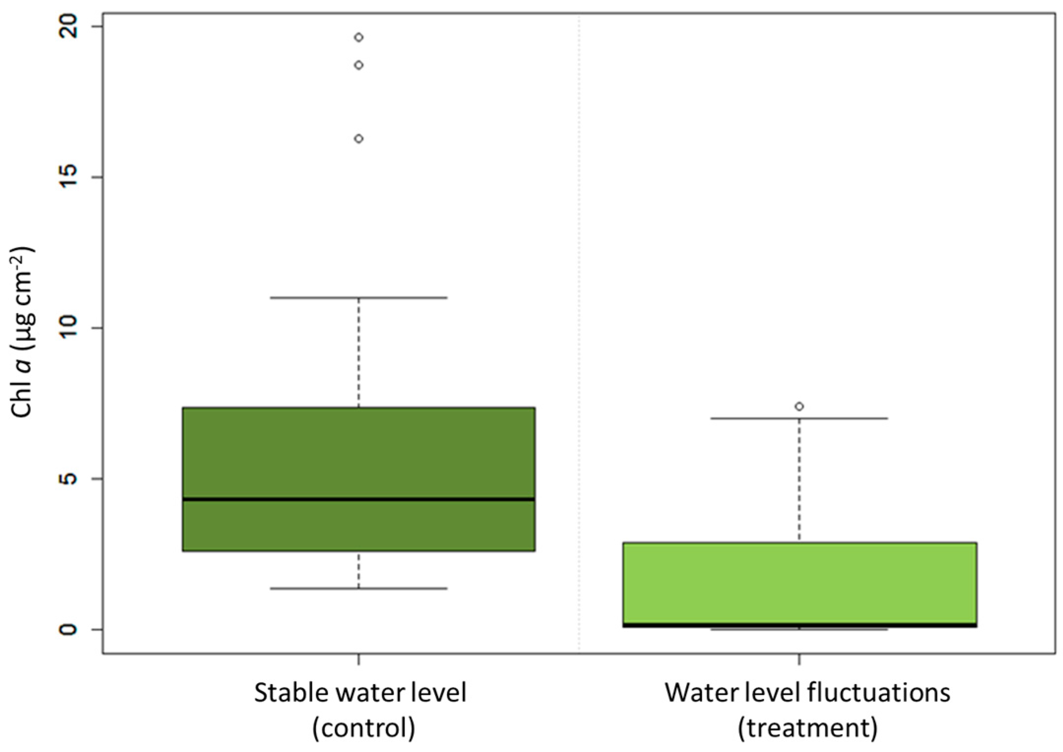 Chlorophyll a concentration in the control mesocosm with stable water level (control) was higher than in the treatment mesocosm in which water level fluctuations (WLF) caused substrates to fall dry (treatment).