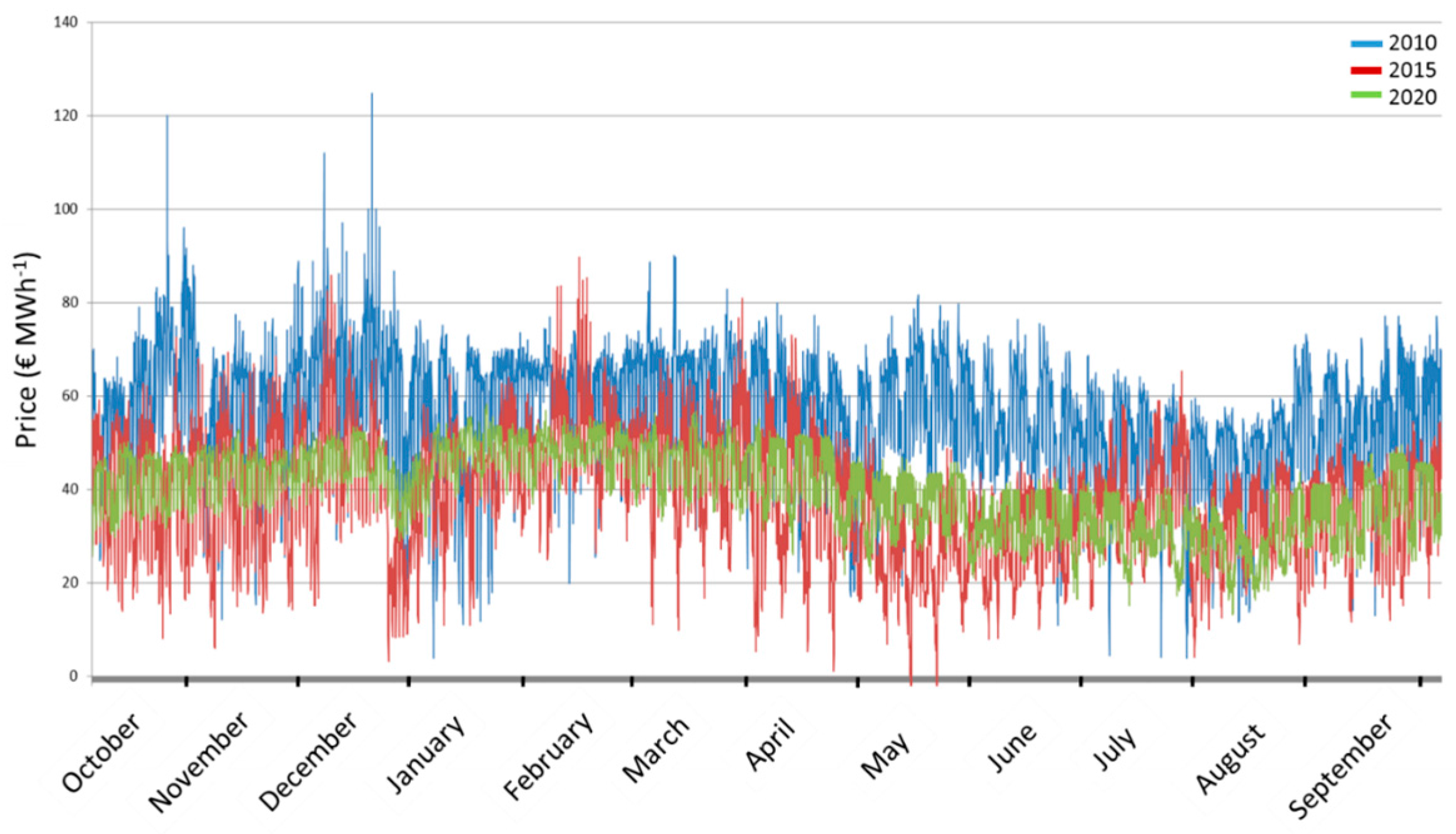Development of electricity prices in € per MWh as modelled for the three scenarios 2010 (blue line), 2015 (red line) and 2020 (green line). Based on [33,34,35]. See Figure A1 for bagplots of year scenarios.