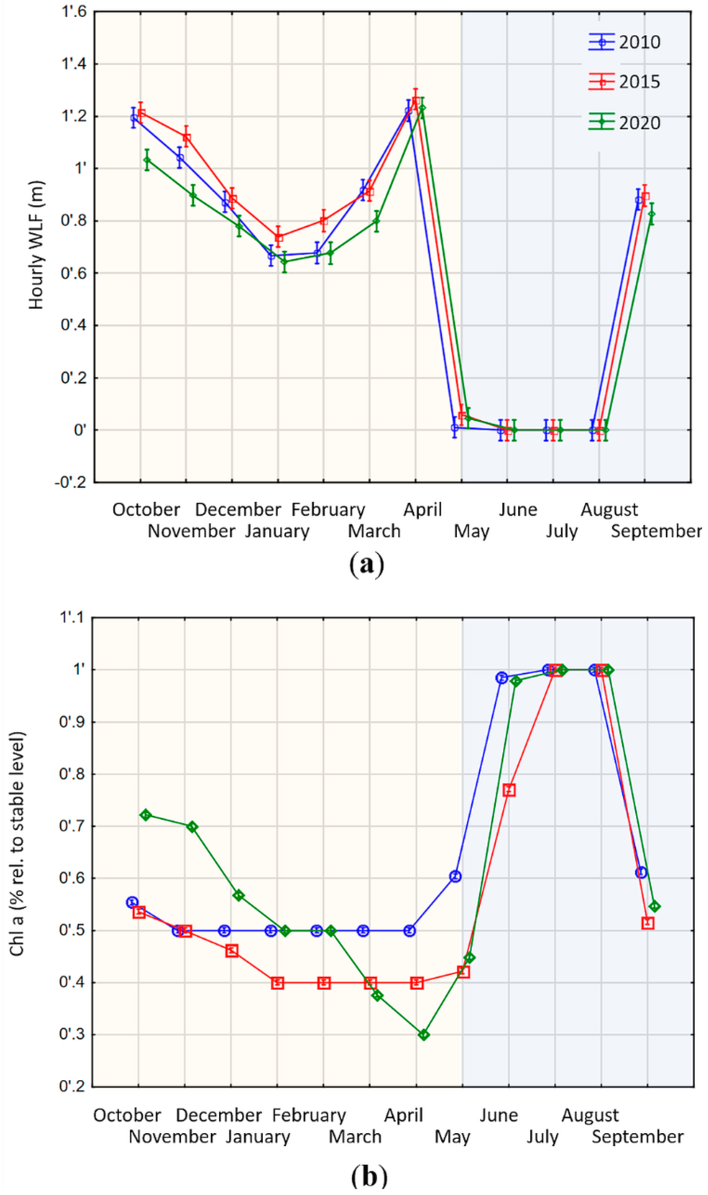 The changes in WLF also translate into the benthic algal biomass levels, which differed significantly among the three scenarios (Chl a homogeneity of slopes test, F = 579, df = 2, SS = 0.925, p < 0.001; Figure 4b). Assuming a complete loss of Chl a after 12 h of beaching (Table 2) and a complete re-growth after 33 days of inundation (Table 3), we could quantify the losses and gains of our assumed ecosystem proxy. The seasonality of inflows also dictates the general temporal trend: decreasing areas available for algal growth until spring as the storage lake gets steadily emptied (periods of general filling oremptying storage volumes indicated by shaded areas in Figure 4 and Figure 5), followed by increasing levels in summer months due to increasing water levels. Yet, the three years show differences that are a direct result of operational decisions. The decision to discharge according to pronounced price peaks during spring (March–May) results in a more pronounced loss in ecosystem function in the 2015 and especially in the 2020 scenario (Figure 4b: March–August).