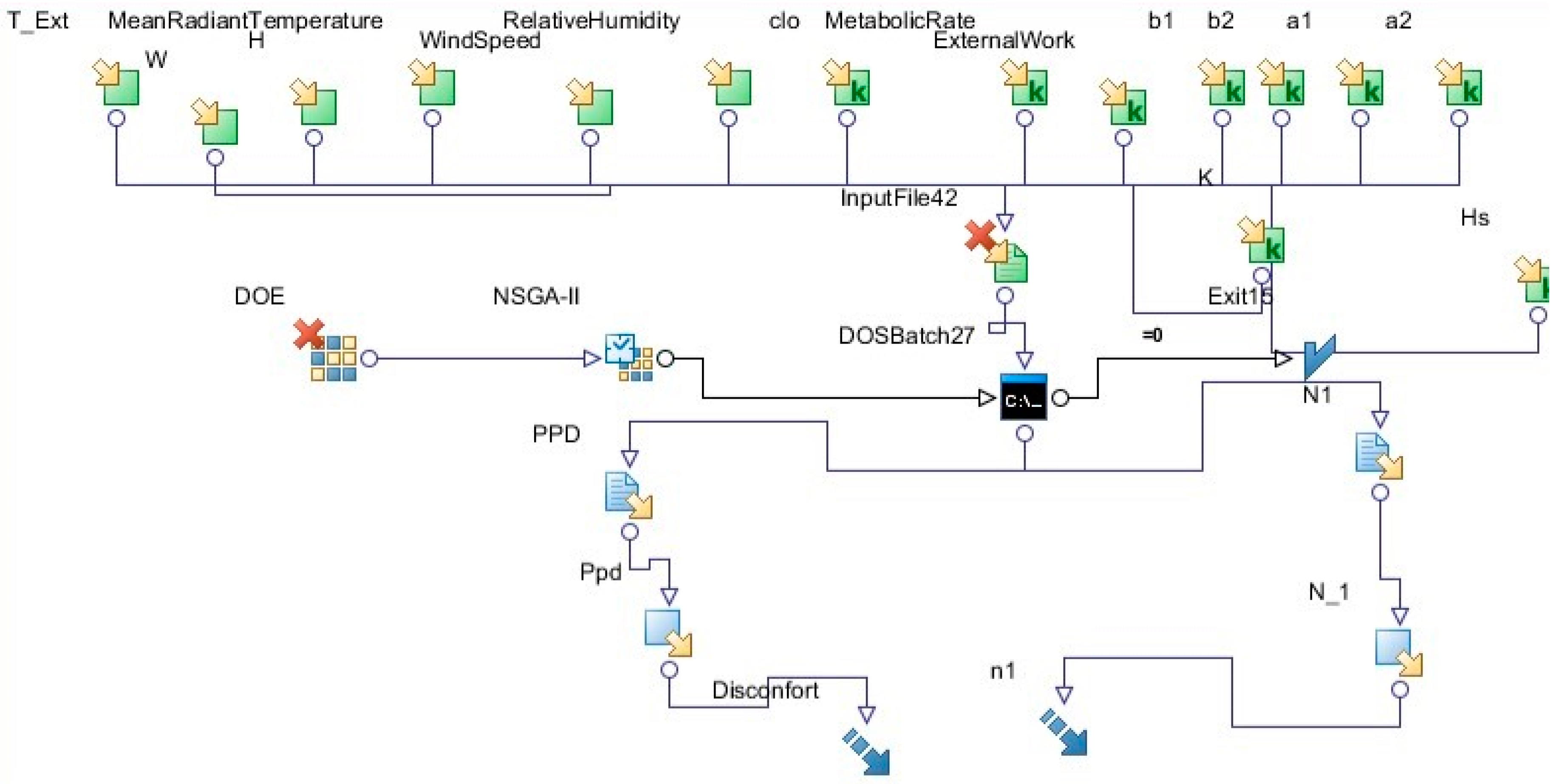The goal of the analysis is encompassed in the objectives. Optimal output values are established for each run and include minimizing or maximizing global parameters, or achieving a specific target. When defining the relevant metrics, competing objectives may be produced, such as when the conditions favor the maximum performance of one objective and the reduced performance of another. Therefore, determining the objectives is as crucial as establishing the input. The user must clearly construct the metrics by which the input is evaluated. In this case, the objective function, i.e., discomfort and urban parameters, were minimized as shown in Figure 1.