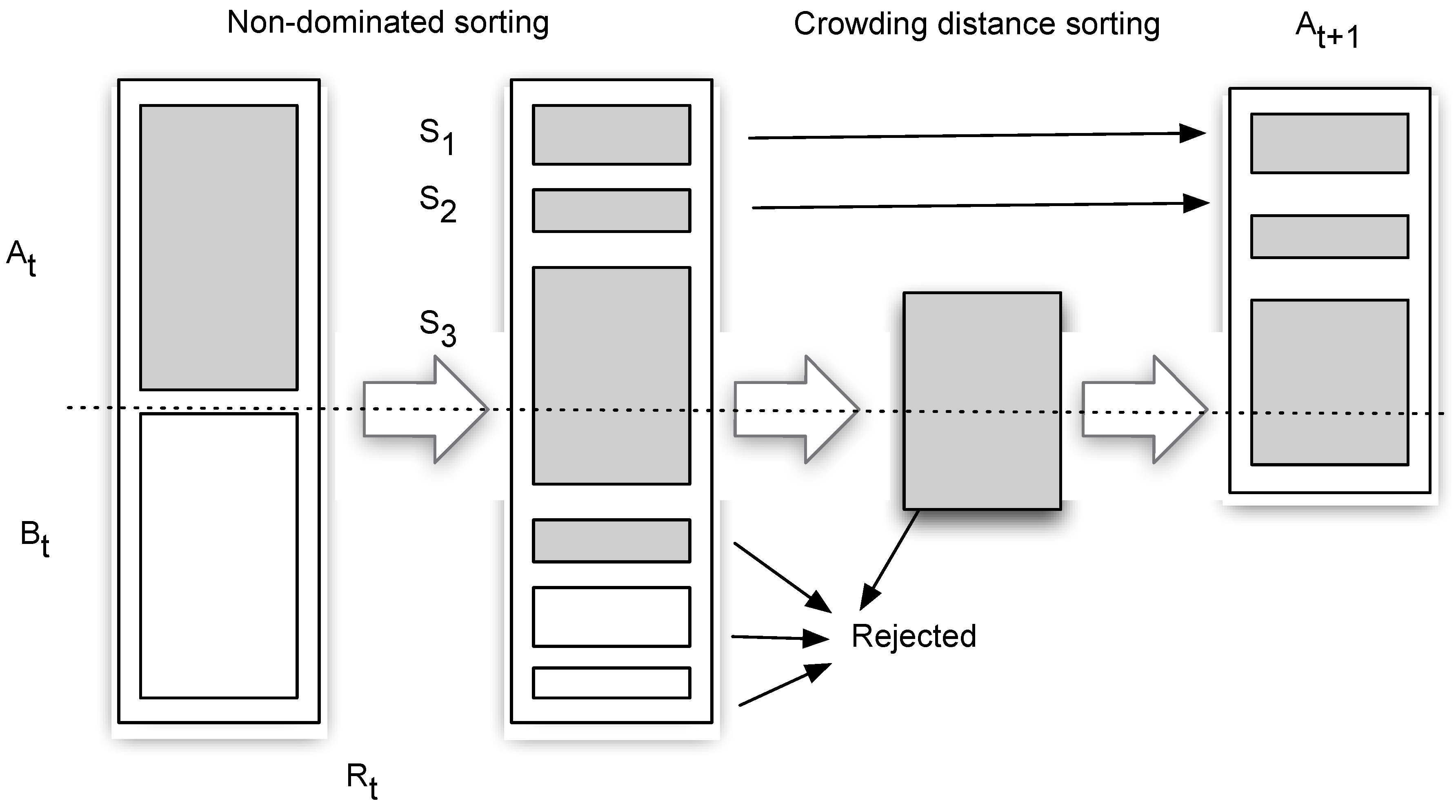 NSGA II (following Deb [40]). A population of parents (At) and offspring (Bt), each of size N, is sorted into non-dominated fronts (S1 is the best, followed by S2, etc.). The new population (At+1), of size N, is then filled with the sorted solutions (Sn) starting from the top. Once At+1 is filled, all remaining solutions are rejected.