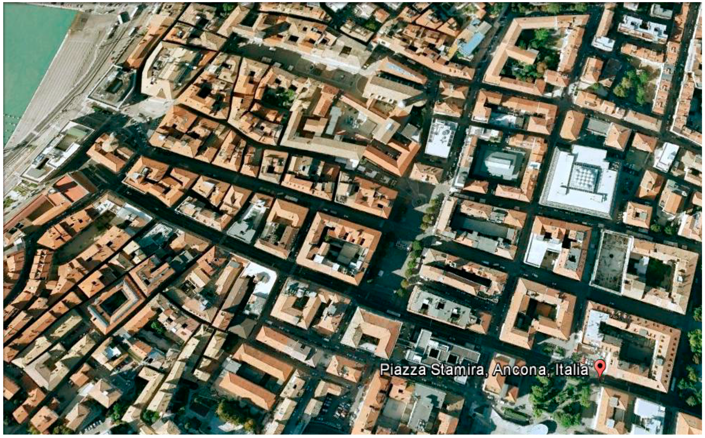 Analysis was carried out for the city of Ancona in the Marche Region in central Italy. Ancona is the largest city in the region, and has been intermittently destroyed in the past by earthquakes and war, enabling newer versions of the city to take shape. “Modern” Ancona is laid out in a grid pattern of wide streets fronted by modern commercial buildings interspersed with ancient buildings and monuments. The study area is the old city (Figure 3), which is generally occupied by medium-scale buildings with internal courtyards.