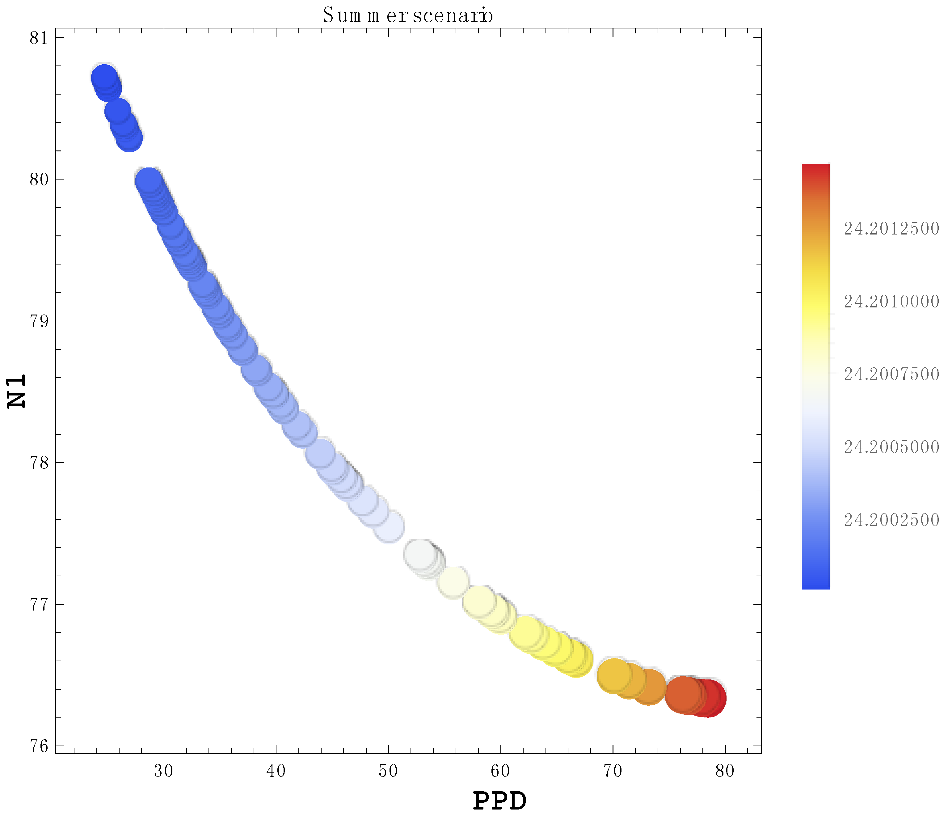 Pareto frontier of solution clusters for the summer scenario. The N1 parameter is on the y-axis and PPD is on the x-axis.