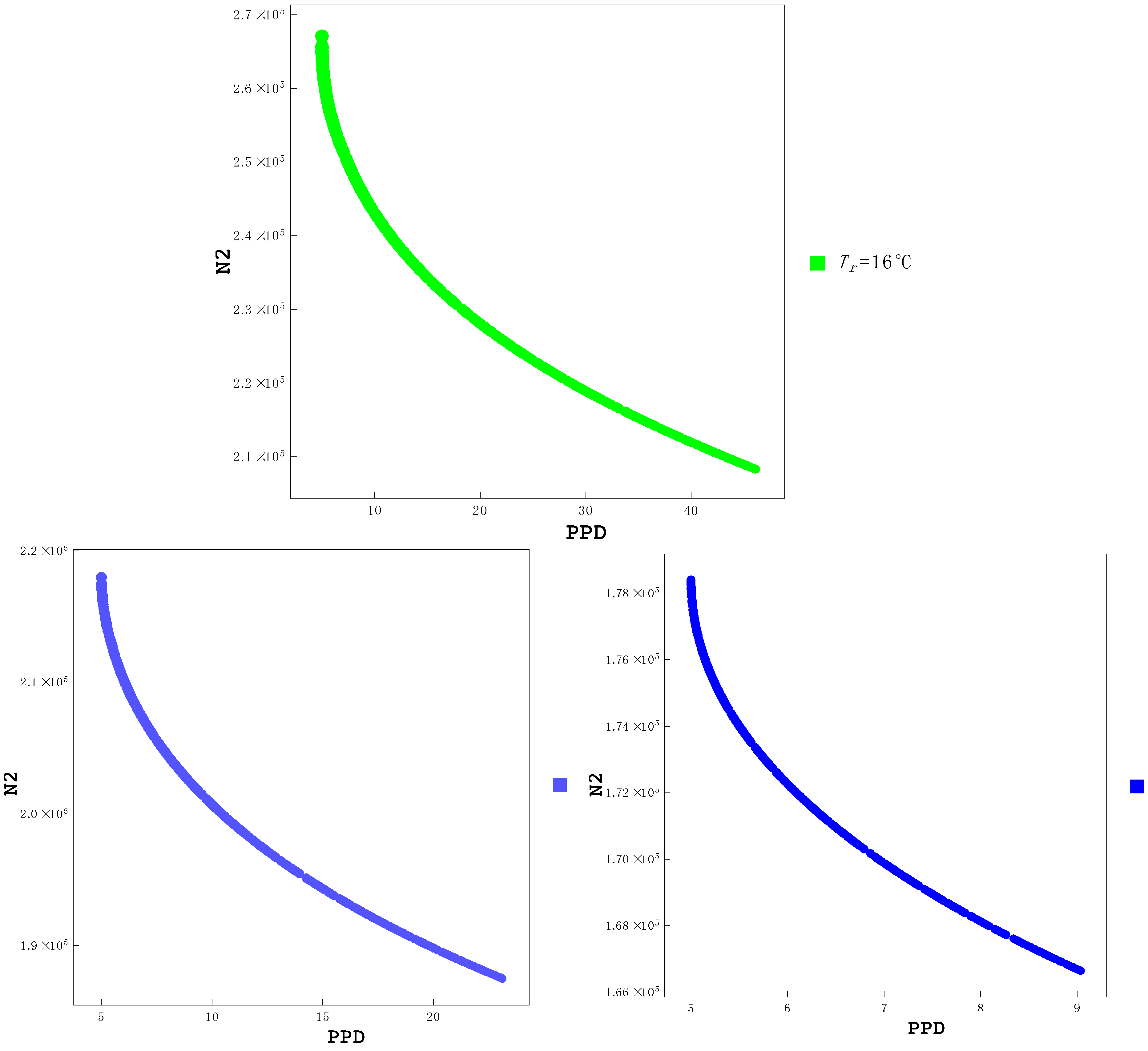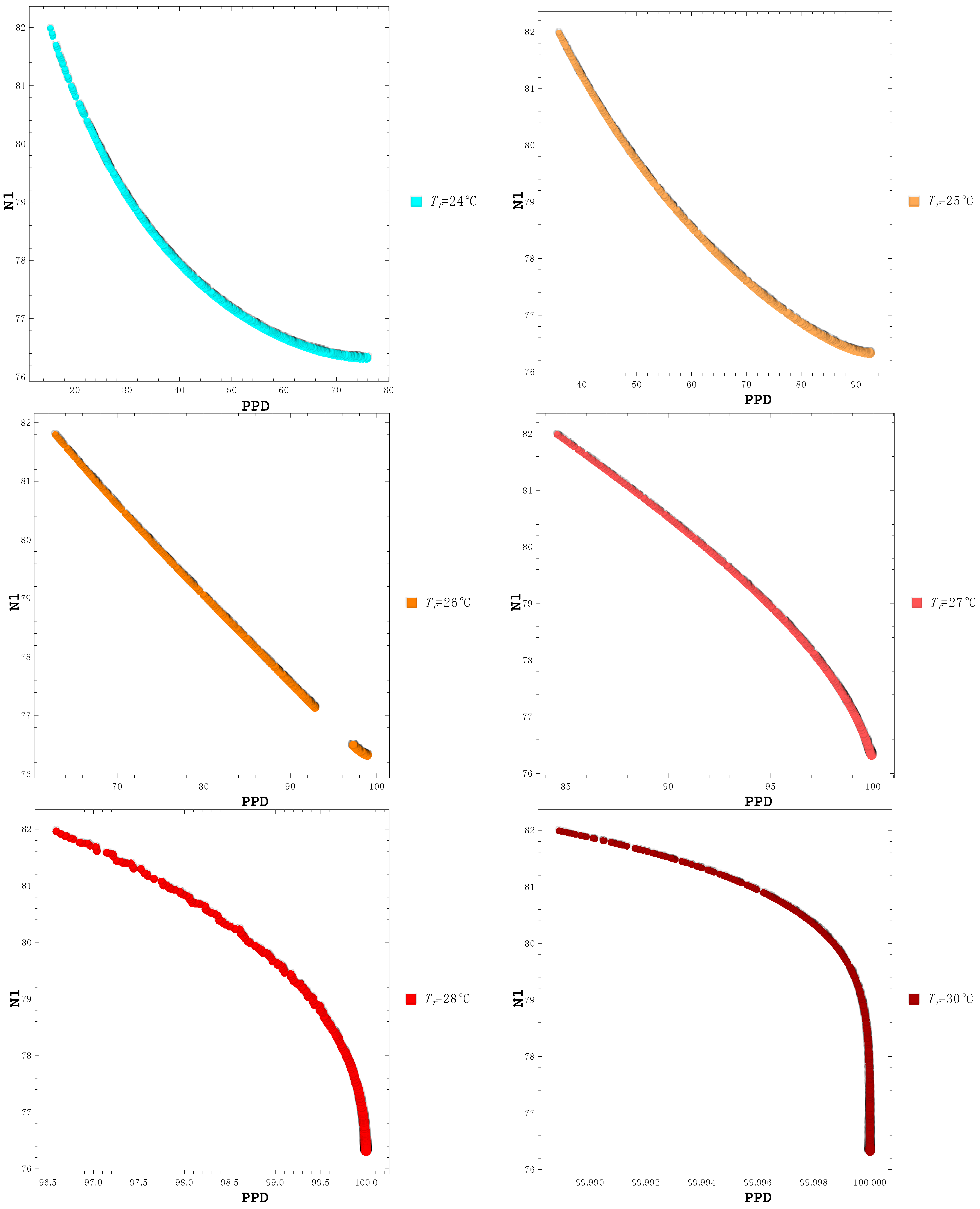 N2 vs. PPD for different temperatures. No Pareto frontier is formed for higher temperatures.