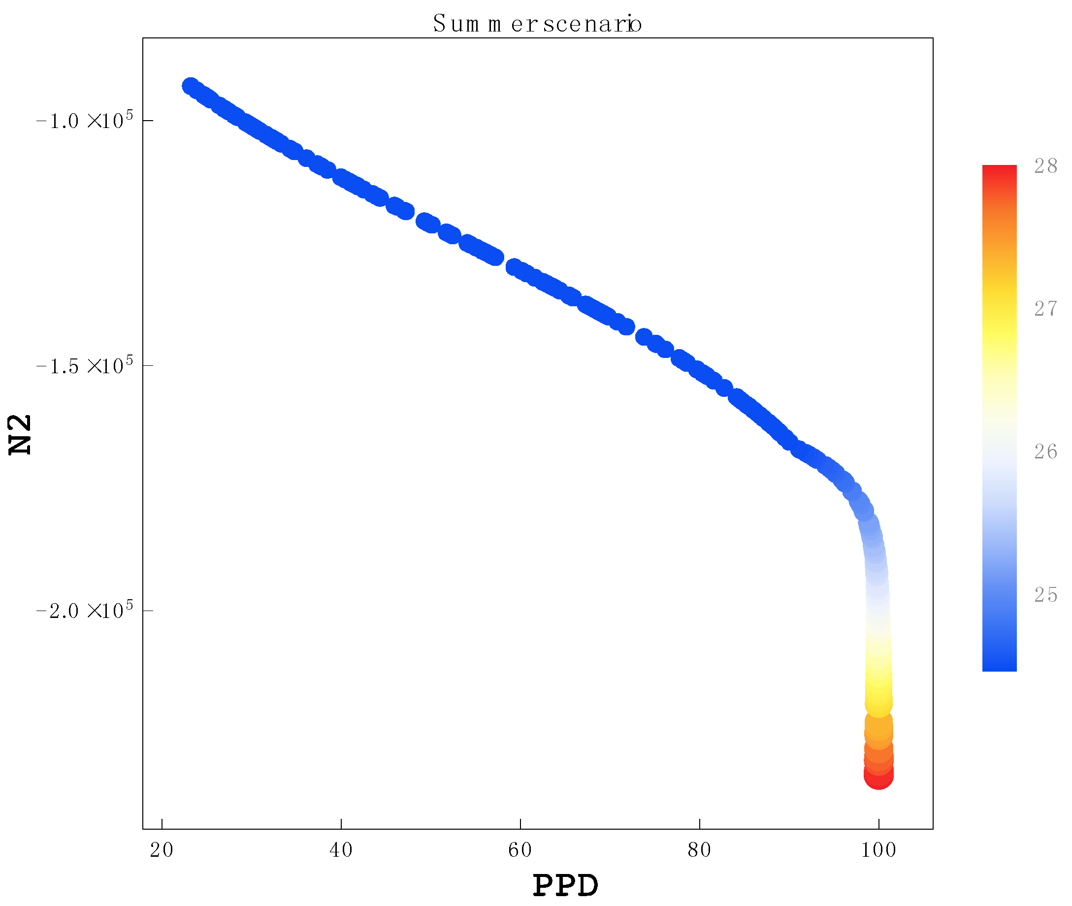 Pareto frontier of solution clusters for the summer scenario. The N2 parameter is on the y-axis and PPD is on the x-axis.