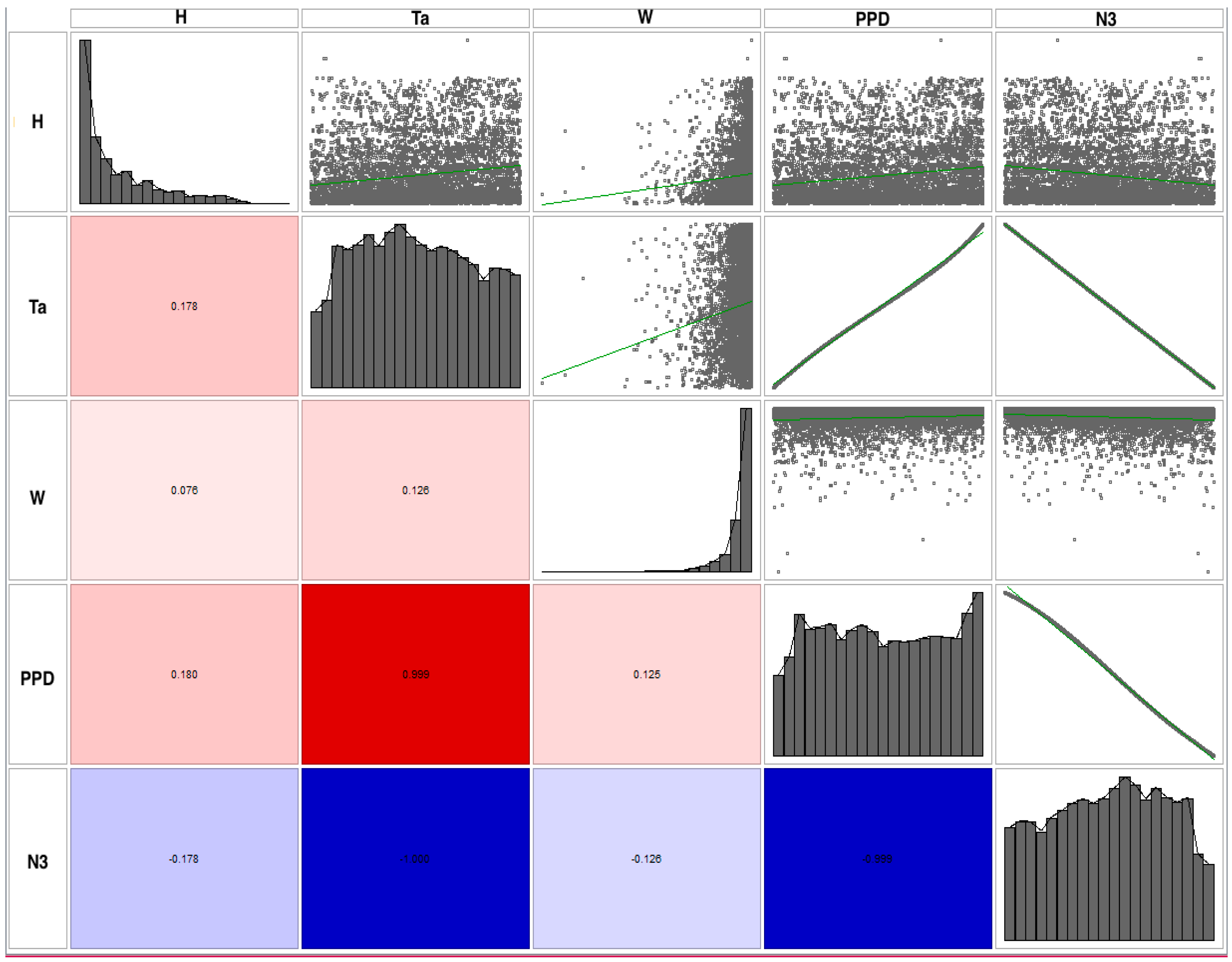 Some interesting correlations can be seen in these plots. As expected and as illustrated in Figure 9, temperature has a minor effect on parameter N1, with a correlation value of 0.110. Figure 11 instead shows that there is a much stronger correlation of temperature with N3, with a value of 1.00. N2 also correlates highly with temperature. This is also confirmed by the scatter plots corresponding to temperature vs. N1, N2, and N3 shown in Figure 9, Figure 10 and Figure 11, respectively. Figure 10 and Figure 11 also reiterate the high correlation of temperature with PPD. One further interesting aspect is the relatively high correlation of building height with PPD as shown in Figure 9 and Figure 10, which also appears in Figure 11 to a lesser degree. This is certainly an aspect that deserves further investigation.
