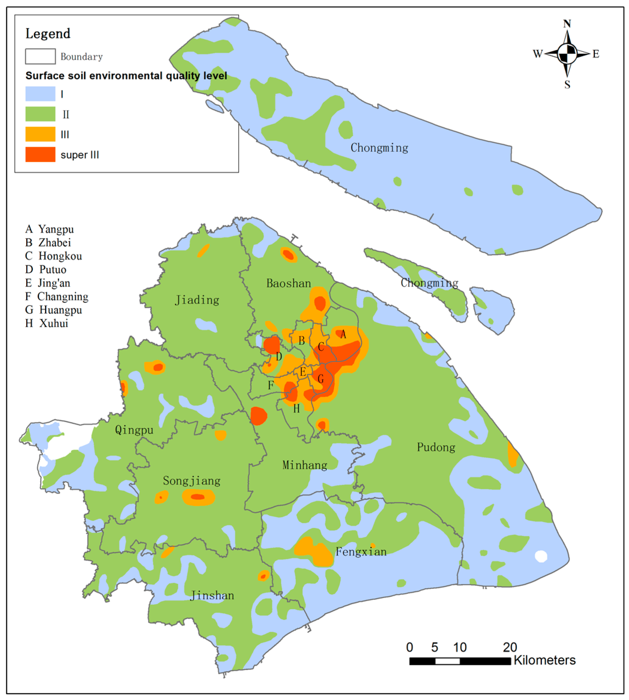 Synthesized results of the evaluation of Shanghai surface soil environmental quality. Source: The figure was adapted from the report of Shanghai land quality monitoring (2009–2012) [34].
