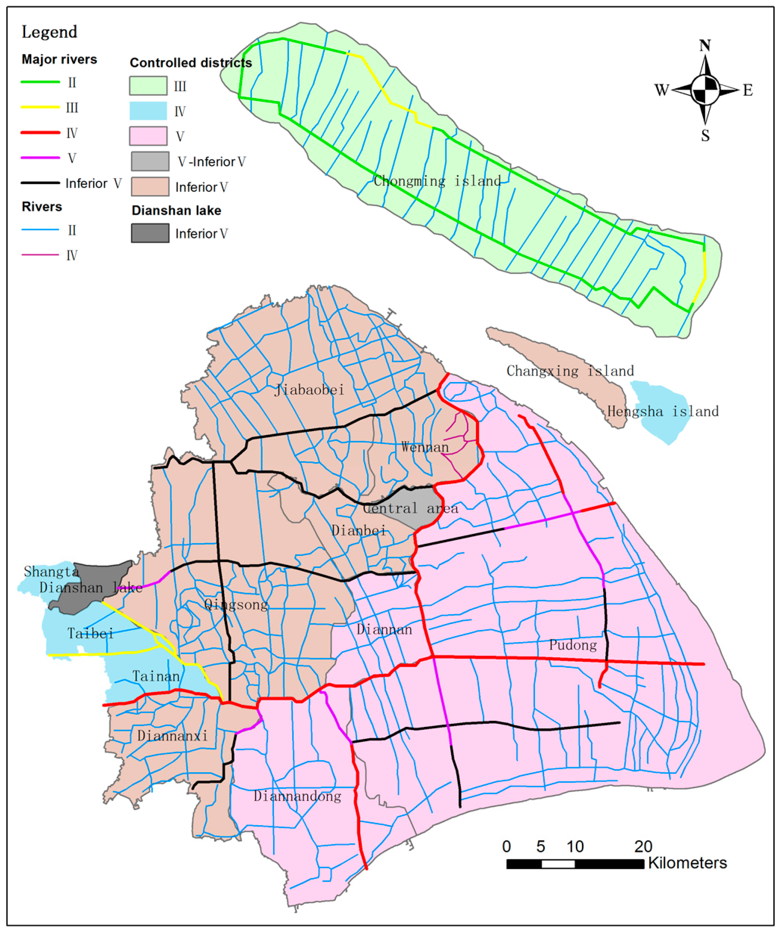 In 2013, the comprehensive results of an evaluation of 14 water quality control districts in Shanghai showed that the water quality of the Chongming island district was ranked as class III. The results of the Hengsha island, Taibei, Tainan, and Shangta districts, were class IV; those of the Diannan, Punandong, and Pudong districts, were class V, and those of the other districts ranked as the inferior class V (Table 4, Figure 2).