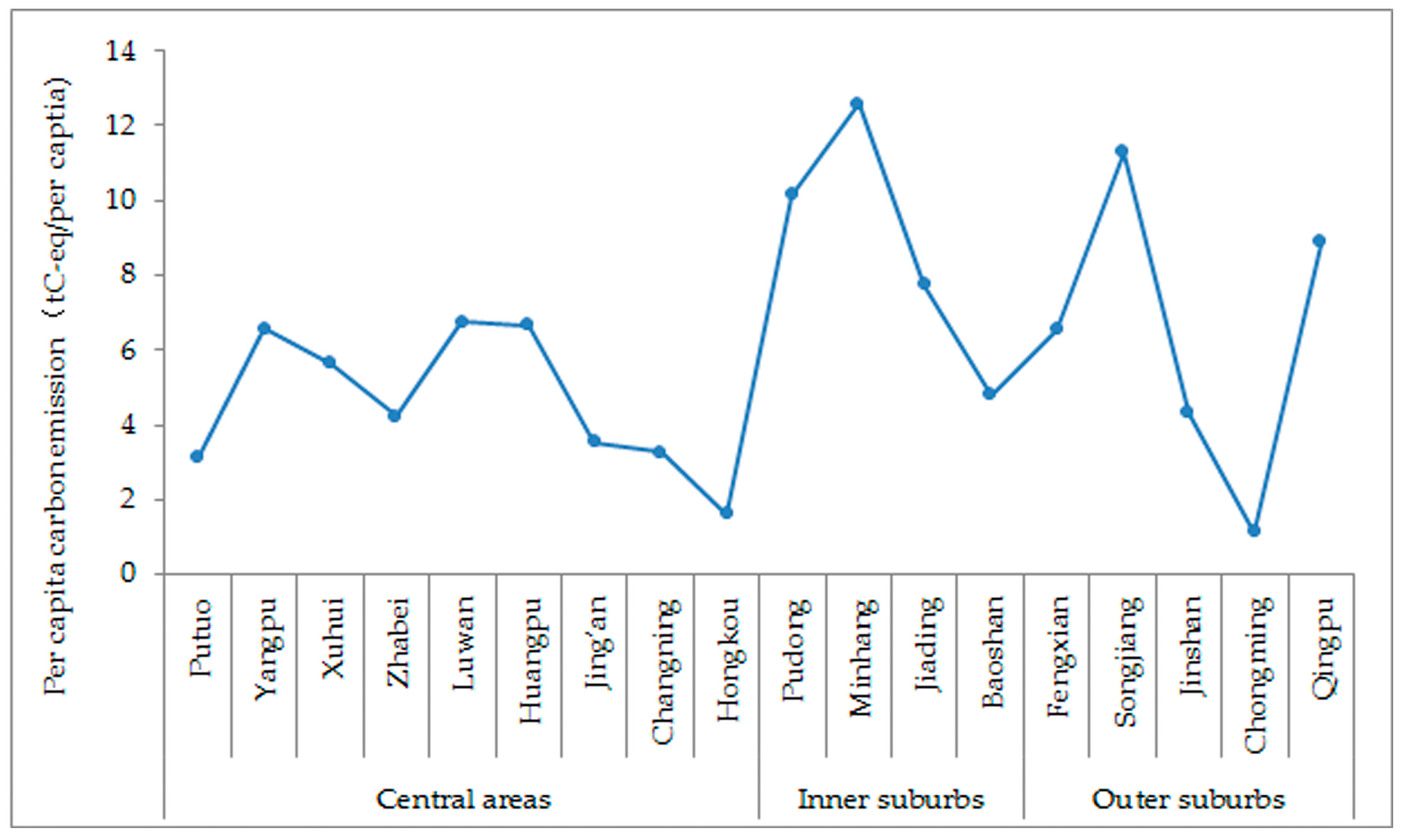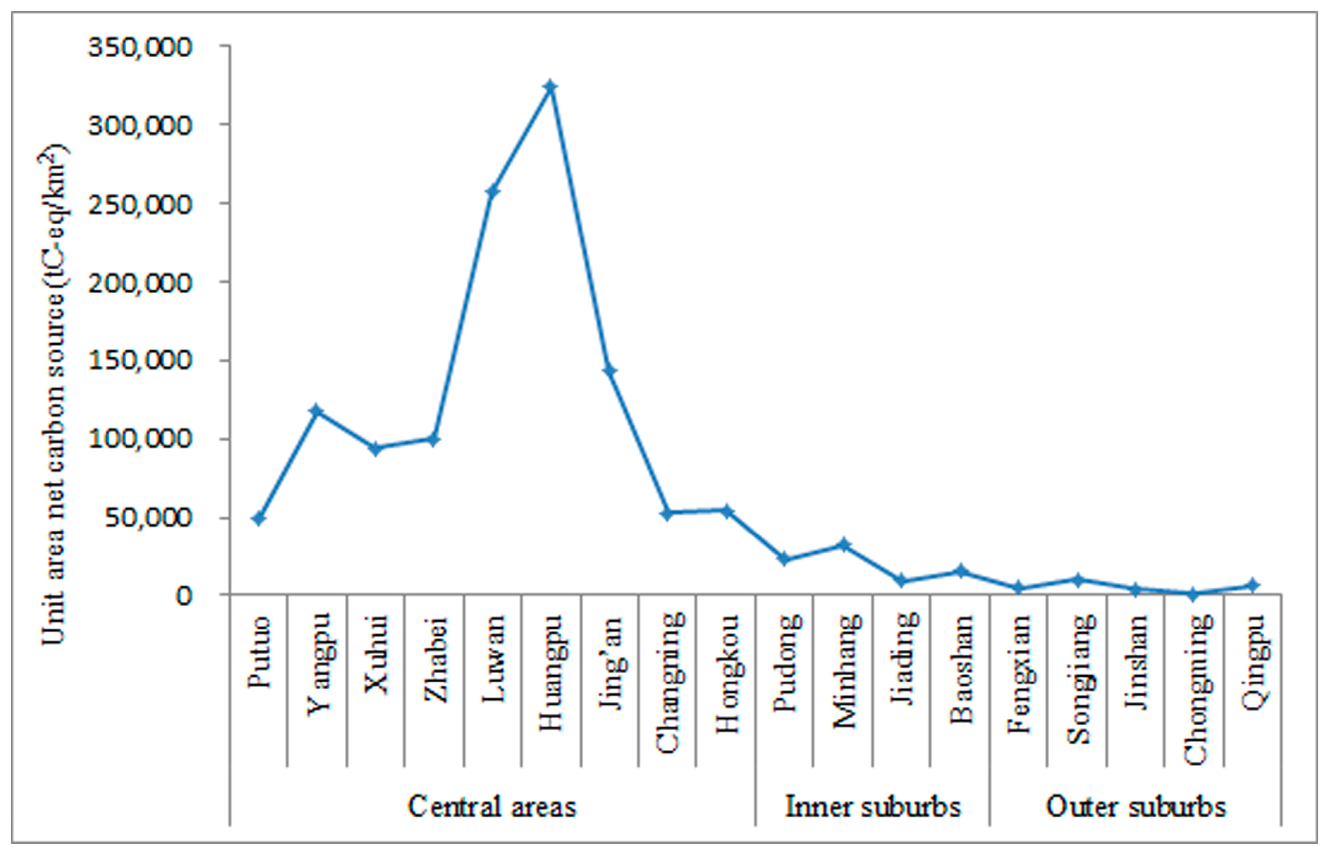 The calculated results (Table 5) are as follows: (1) the total carbon sources of the Pudong, Minhang, Songjiang, and Yangpu, districts are relatively high, whereas the sources of other districts are relatively low; (2) The total carbon sinks of Chongming, Qingpu, Jinshan, Fengxian, Songjiang, and other suburbs are larger, whereas those of the central urban areas are smaller; (3) With respect to per capita carbon emissions by the registered population, those of the central urban areas are generally lower than those in the suburbs, whereas those of Minhang, Pudong, Songjiang, Qinpu, and Jiading, are higher (Figure 3); (4) In terms of net carbon source per unit area, the central urban areas are generally higher than the suburbs, and the core areas are overall much higher than the peripheries of the central urban areas. Additionally, the periphery of the central urban areas is higher than the inner suburbs, the inner suburbs are higher than the outer suburbs, and the features show a diminishing trend gradient (Figure 4); Finally, (5) with respect to net carbon source per unit GDP, there is no obvious law of distribution. Both high-value districts (Luwan and Yangpu), and low-value districts (Hongkou and Changning), exist in the central urban areas, and the net carbon sources per unit GDP of Minhang, Songjiang, Fengxian, Qingpu, Jinshan, and other suburbs, are higher, whereas those of Huangpu, Putuo, and other central urban areas, are relatively low. Those of Pudong, Jiading, Xuhui, Jing'an, and other districts, are in the middle level.