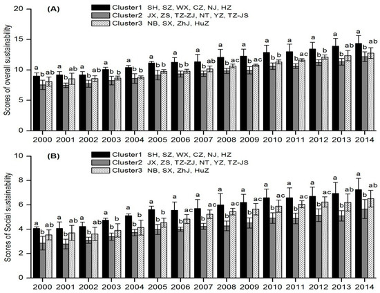 Mean and standard deviation of: overall (A); social (B); environmental (C); and economic (D) sustainability scores of the three city clusters from 2000 to 2014.