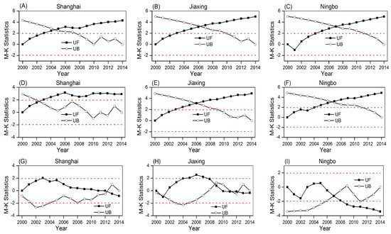 The Mann–Kendall test (MK test) [39,40,41], a nonparametric statistical test, is commonly used for trend analysis and detecting mutation of a time series. It determines the change trend of sequence by calculating the standardization of time series statistics based on the correlation between the ranks of a time series and their time order [42,43]. It works for all distributions, and has been widely used in hydroclimatic fields [42,44,45,46] (see the previous studies mentioned above for more details on the algorithm). Two parameters of UF and UB are usually used to represent the curve and reverse curve of the statistical sequence, respectively. A UF or UB value larger than zero indicates an increasing trend. Otherwise, it indicates a downward trend. Given a level of significance α, when the absolute value of MK statistics (ZMK) is larger than the confidence limit (Zα) (e.g., = 0.05, Zα = ±1.96), the trend of the sequence is significant. If UF and UB intersect, the intersection is the abrupt change point (i.e., mutation). When the intersection falls between the confidence limit (e.g., ±1.96), there is a significant mutation in the sequence. In this study, M-K test was used to detect the trend of OS, SS, EnS and EcS from 2000 to 2014, as well as the mutation in the time series. It was calculated by MATLAB (version: 2015a, The MathWorks Incorporated, Natick, MA, USA).