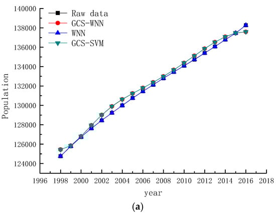 Based on the historical data of population, per capita GDP, standard coal consumption and proportion of thermal power from 1995 to 2016, historical data were trained and predicted by using GCS-WNN model, WNN model and GCS-SVM model respectively. The prediction results are shown in Figure 4.