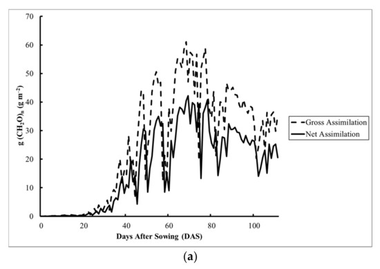 (a) Estimated daily gross and net assimilation for SIL05 sown early in 2012. (b) Estimated accumulation of gross and daily assimilation for SIL05 sown early in 2012.
