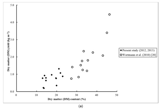 As mentioned in the Introduction, Inuyama et al. [27] obtained stem weights of sorghum in the range of 3.37–4.48 kg m−2 on a fresh matter basis. These values are comparable to the lower range of the values obtained in the present study, i.e., 3.35–7.56 kg m−2. To compare yield levels obtained in the present study in terms of those reported by other workers, DM yield was plotted against DM content (Figure 5a,b) [20,43,44]. Compared on a DM basis, yields obtained in the present study were relatively lower than those reported by Wortmann et al. [20] (Figure 5a) and Fukazawa et al. (Figure 5b) [43], while they were comparable to those reported by Harada et al. (Figure 5b) [44]. High values of DM content reported by Wortmann et al. [20] and Fukazawa et al. [43] appeared to explain at least partly the differences in DM yield between their studies and the present study (Figure 5a). As to stem brix, Kamiyama et al. [45] observed values in the range of 13.7% to 16.2% for three cultivars in Ibaraki prefecture, while stem brix in the present study and especially of FS501 was generally lower. Kawahigashi et al. [46] reported brix values ranging from 2.8% to 19.6% for 109 sorghum accessions where SIL05 showed a value as high as 19.4% compared to the range of 5.3% to 16.2% observed in the present study for the same cultivar. When plotted against DM content, stem brix was positively correlated to DM content (Figure 5c) [20,43], which was in accordance with Table 6.