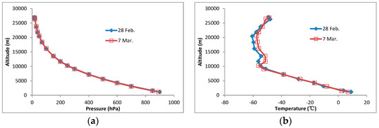 In addition, radiosonde balloons were released during SPARK satellite overpass periods to measure the vertical profiles of atmospheric pressure, temperature, and humidity; balloons were released at 05:49:55 and 05:05:08 UTC on 28 February and 7 March 2017, respectively. Figure 10 shows the vertical profiles measured on each date. The variations in pressure and temperature with altitude are similar between the two dates. The humidity changes little at altitudes greater than 5000 m.